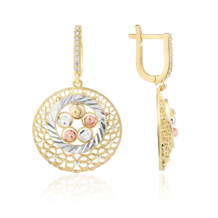 Pozłacane kolczyki ze srebra próby 925 urzekają ażurowym wzorem, który dodaje im lekkości i elegancji. W centralnej części znajdują się cztery kuleczki w różnych kolorach, otoczone grawerowaną obręczą. Dzięki wygodnemu zapięciu typu bigiel kolczyki są komfortowe w noszeniu i doskonale sprawdzą się zarówno na co dzień, jak i na wyjątkowe okazje.