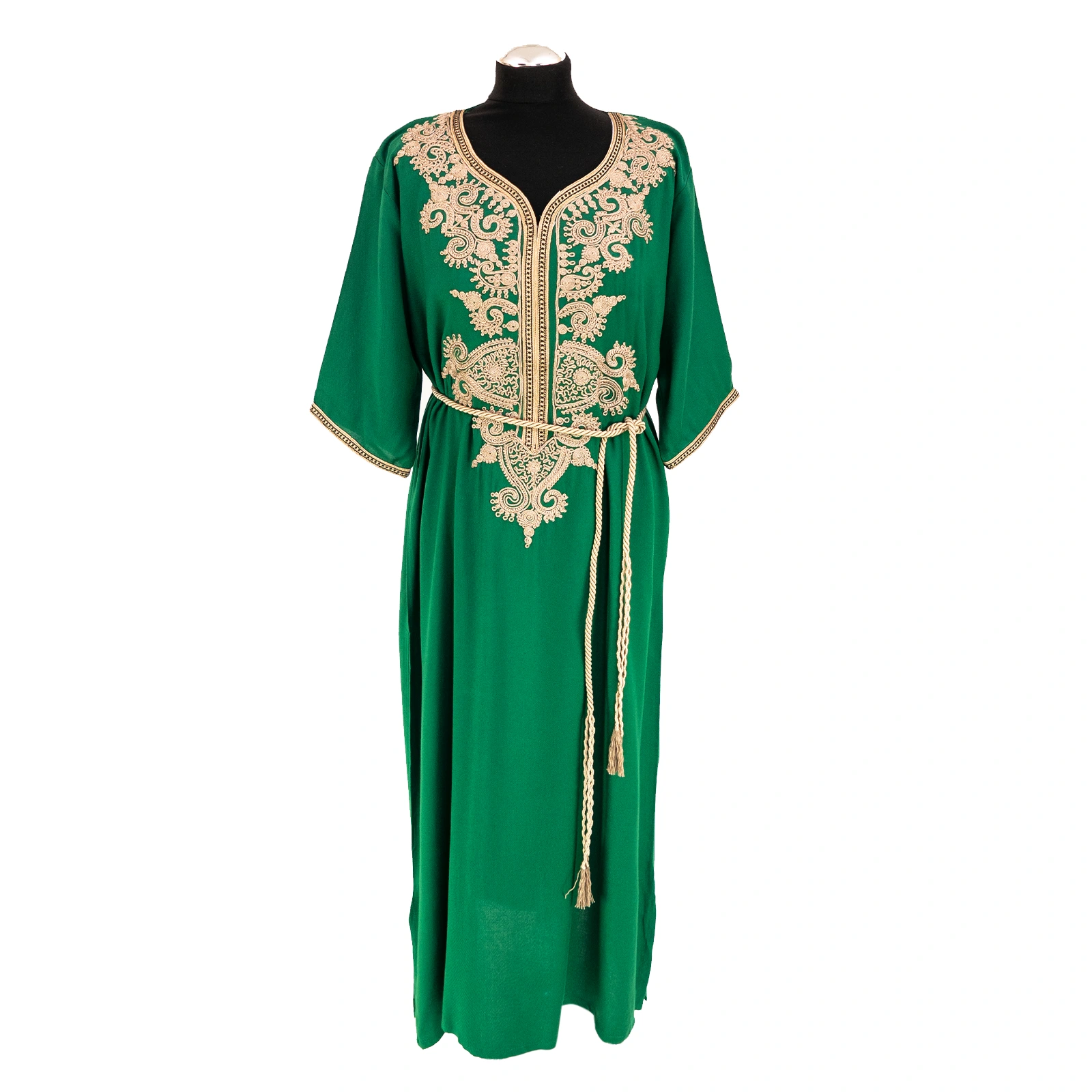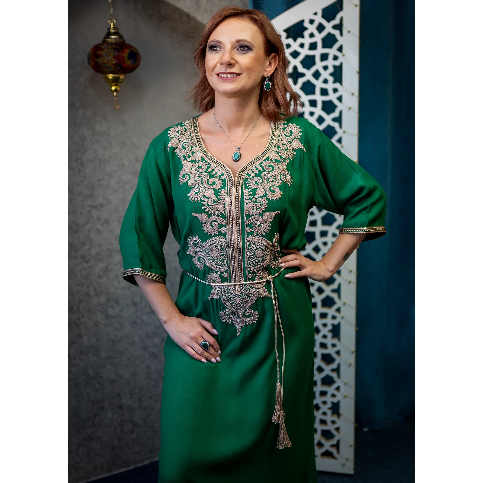 Elegancka i pełna uroku arabska suknia galabija w głębokim zielonym odcieniu, inspirowana bujnymi oliwnymi gajami rozciągającymi się na wzgórzach Maroka. Wykonana ze 100% bawełny, suknia zapewnia komfort i przewiewność, co czyni ją idealnym wyborem na ciepłe dni i letnie wieczory. Ręcznie haftowane wzory w orientalnym stylu dodają jej wyjątkowego charakteru, przywołując na myśl spokojne i malownicze marokańskie krajobrazy. W zestawie znajduje się dopasowana przepaska, która subtelnie akcentuje talię, gwarantując eleganckie dopasowanie do sylwetki. Galabija „Oliwne Wzgórza” łączy w sobie klasyczną elegancję z marokańskim wdziękiem, przenosząc każdą kobietę w świat zielonych, oliwnych wzgórz i naturalnego piękna.