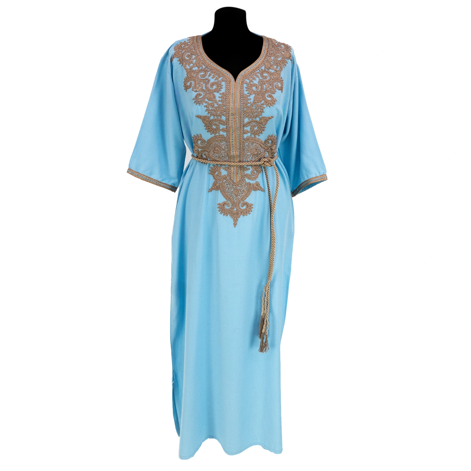Subtelna i orzeźwiająca arabska suknia galabija w delikatnym błękitnym odcieniu, inspirowana rzadkim, lecz magicznym zjawiskiem rosy pojawiającej się na piaskach pustyni o świcie. Wykonana ze 100% bawełny, suknia zapewnia lekkość i przewiewność, co czyni ją idealnym wyborem na ciepłe, letnie dni. Ręcznie wykonane hafty w orientalne wzory dodają jej elegancji i nawiązują do tradycji Maroka. W zestawie znajduje się dopasowana przepaska, która subtelnie podkreśla talię, gwarantując wygodę i idealne dopasowanie do sylwetki. Galabija „Rosa Pustyni” to połączenie delikatnej kolorystyki i marokańskiej estetyki, które przenosi każdą kobietę w świat tajemniczych pustynnych krajobrazów.