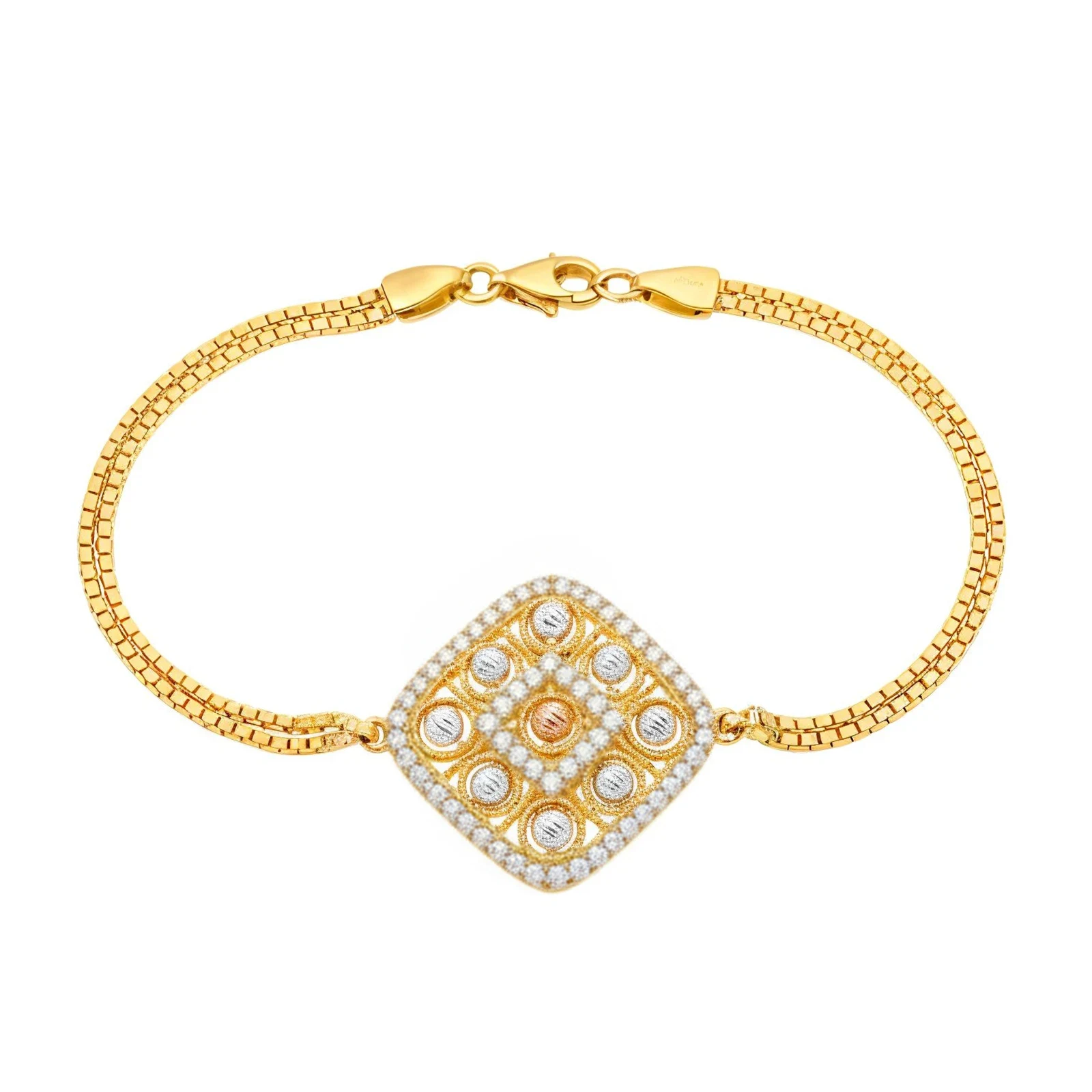 Orientalny blask i jubilerska precyzja łączą się w niezwykle efektowny sposób w bransoletce z pozłacanego srebra 925 z kolekcji Złoto Haremu. Centralnym punktem biżuterii jest dekoracyjny element w kształcie delikatnego rombu, wysadzany licznymi cyrkoniami, które tworzą wielowarstwowy, symetryczny układ błyszczących zdobień.