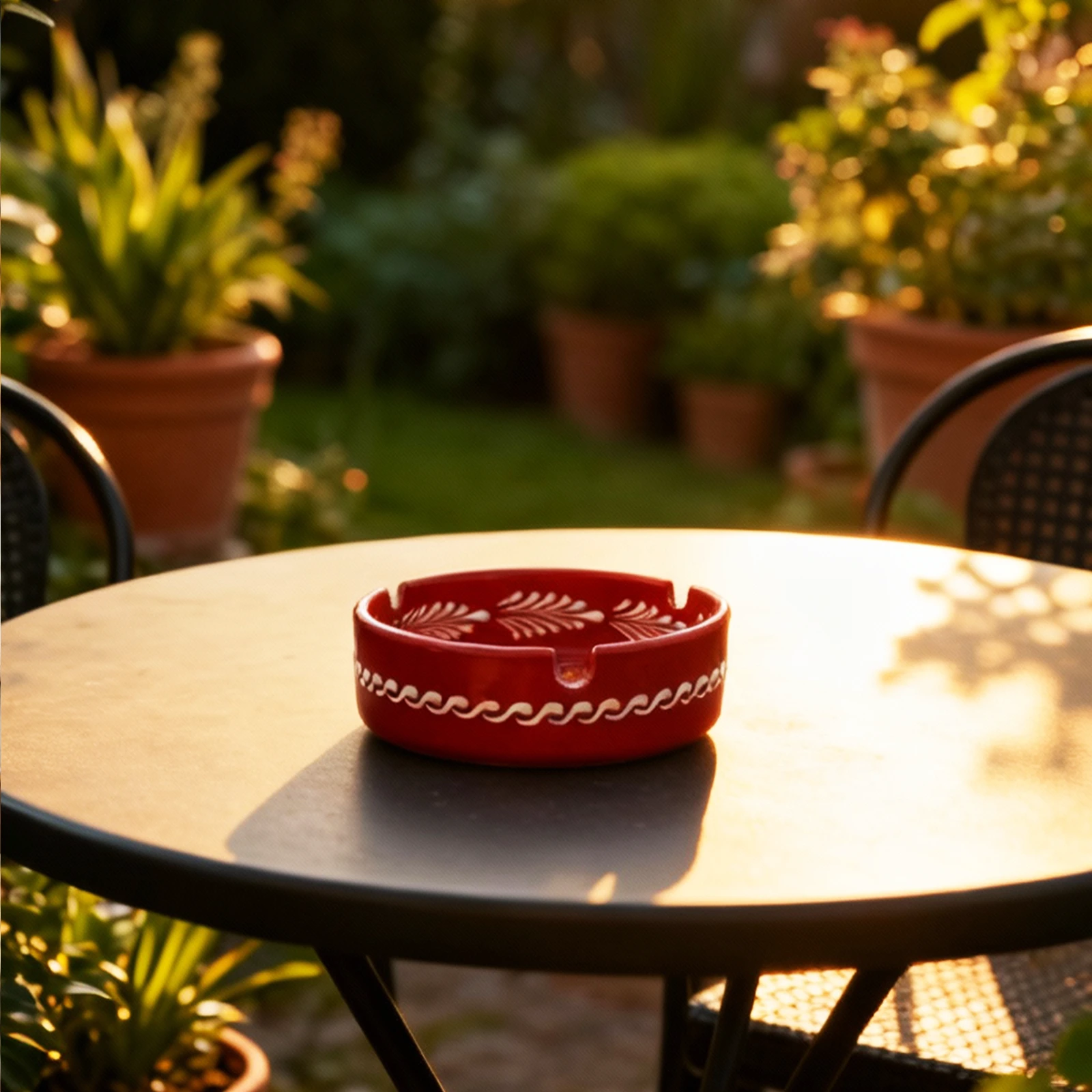 Ceramiczna popielniczka w intensywnie czerwonym kolorze to wyjątkowy dodatek, który łączy funkcjonalność z orientalnym wzornictwem. Zdobiona ręcznie delikatnym ornamentem roślinnym i geometrycznym, przyciąga uwagę i podkreśla charakter wnętrza lub tarasu. Dzięki trwałej ceramice popielniczka jest odporna na wysoką temperaturę i łatwa w czyszczeniu. Ręczne wykonanie sprawia, że każda sztuka jest unikatowa, a drobne różnice w kolorach i detalach dodają jej autentycznego uroku.