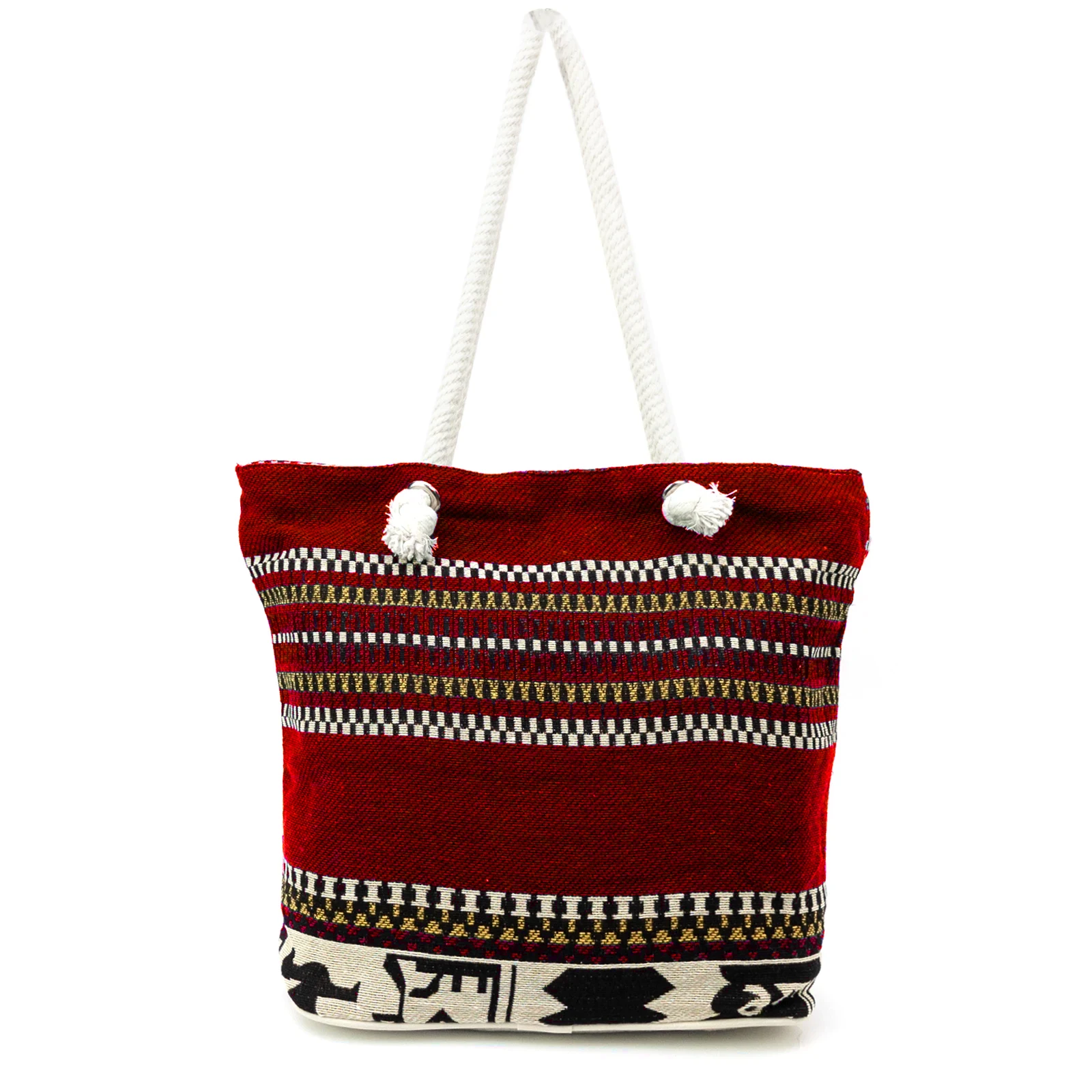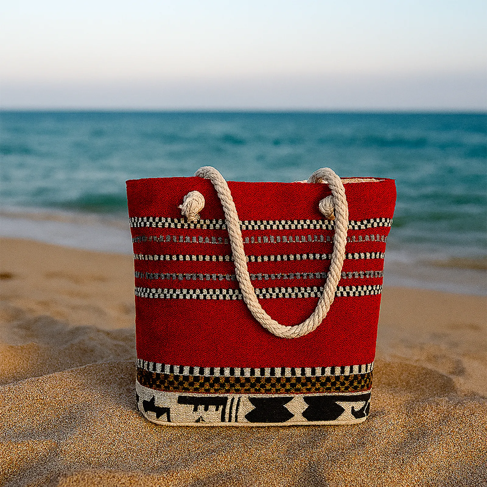 Torba plażowa wykonana z przyjemnej w dotyku tkaniny szenilowej, utrzymana w ciepłych, czerwonych tonach z pasami w orientalnym stylu. Jej barwna kompozycja przyciąga uwagę i doskonale sprawdzi się jako dodatek do letnich stylizacji. Wnętrze torby zostało wykończone wzorzystą podszewką, a funkcjonalność zapewniają trzy praktyczne kieszenie - dwie otwarte oraz jedna zamykana na suwak. Dzięki grubym, sznurkowym rączkom torba wygodnie leży na ramieniu, nawet gdy jest pełna. Idealna na plażę, zakupy czy letni spacer.