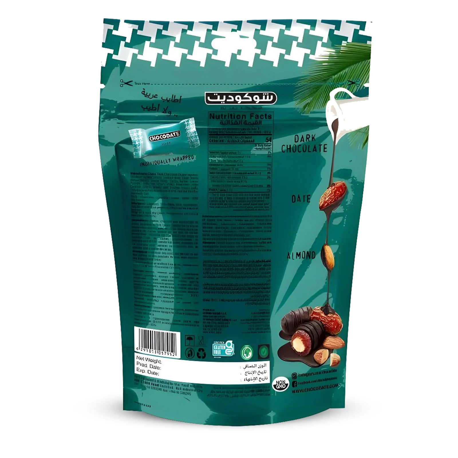 Chocodate No Added Sugar to wyjątkowe daktyle nadziewane migdałami i oblane aksamitną gorzką czekoladą bez dodatku cukru. Każdy daktyl skrywa w sobie prażony migdał, a naturalna słodycz owocu idealnie łączy się z intensywnym aromatem ciemnej czekolady o wysokiej zawartości masy kakaowej. Produkt jest bezglutenowy i nie zawiera GMO, co czyni go świadomym wyborem dla osób poszukujących zdrowszych przekąsek.