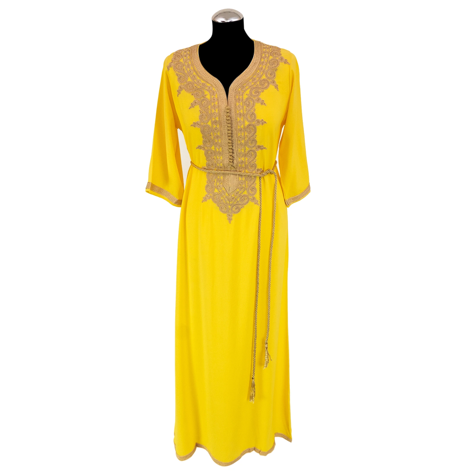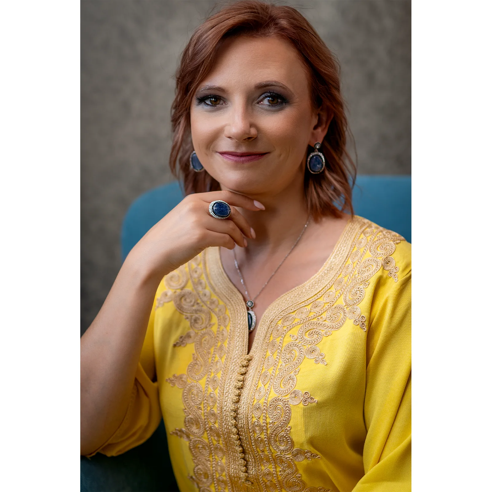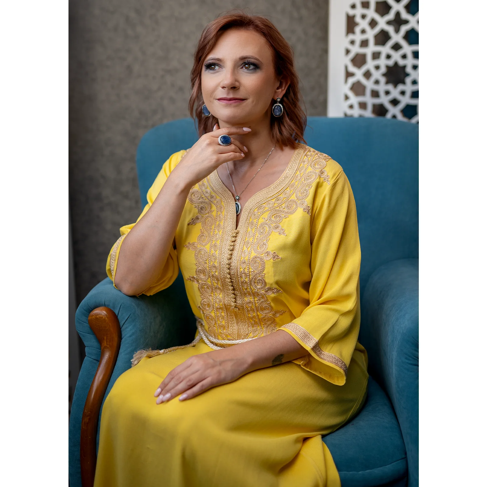 Promienna arabska suknia galabija w ciepłym, żółtym odcieniu, inspirowana blaskiem słońca odbijającym się od złocistych piasków pustyni Erg Chebbi. Wykonana z lekkiej, oddychającej bawełny, doskonale sprawdza się w letnie dni, zapewniając wygodę i przewiewność. Suknia ozdobiona jest ręcznie haftowanymi orientalnymi wzorami, które dodają jej wyjątkowego uroku. Zestawiona z delikatną przepaską, która pięknie podkreśla talię, „Słoneczne Piaski Erg Chebbi” to idealny wybór dla kobiet pragnących dodać swoim stylizacjom odrobinę marokańskiego słońca i egzotyki.