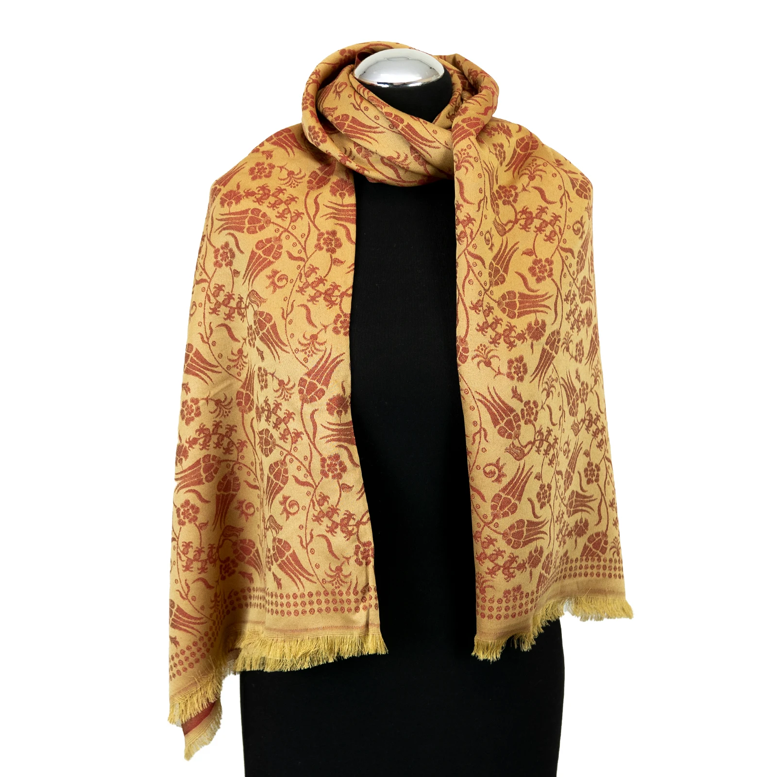 Szal utrzymany jest w złoto-miodowej tonacji z czerwono-terakotowym ornamentem, który przywodzi na myśl tulipany i roślinne motywy charakterystyczne dla sztuki osmańskiej. Całość wygląda ciepło, elegancko i bardzo szlachetnie, dzięki czemu szal doskonale dopełnia zarówno codzienne, jak i bardziej klasyczne stylizacje.