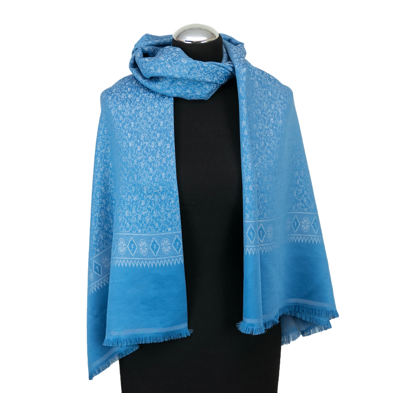 Szal utrzymany jest w czystym, niebieskim tonie o chłodnym, spokojnym charakterze. Kolor nie jest ani ciemny, ani intensywny – to klasyczny, elegancki błękit. Całość zdobi drobny, orientalny ornament, inspirowany tradycyjnymi tureckimi tkaninami, który nadaje szalowi lekkości i subtelnej elegancji.
