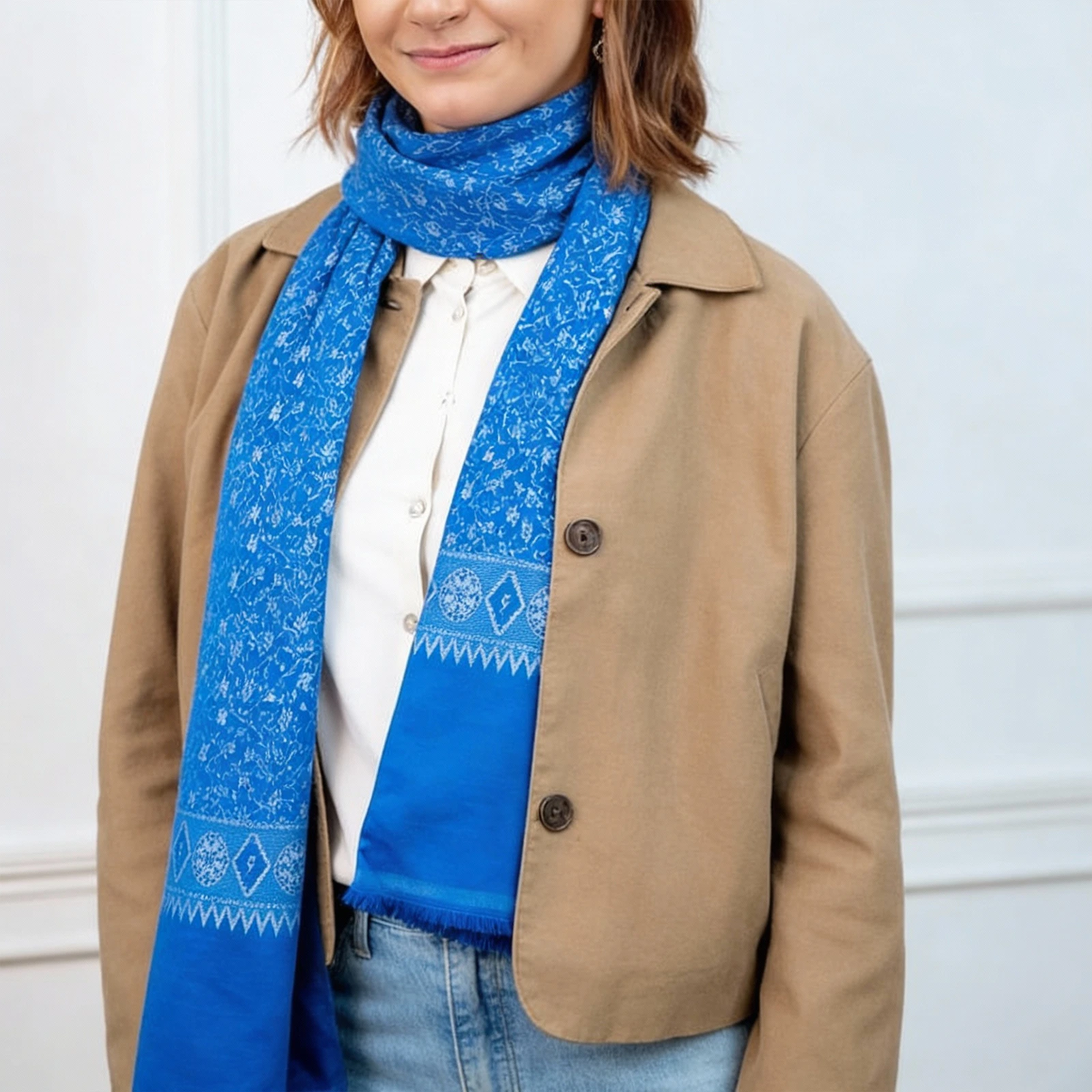 Ten szal to dobry wybór na prezent dla osoby, która ceni proste, eleganckie dodatki z orientalnym akcentem. Niebieski kolor jest uniwersalny i ponadczasowy, a delikatny wzór sprawia, że szal wygląda jak starannie wybrana pamiątka z podróży.