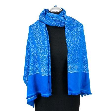 Szal utrzymany jest w jednolitym, niebieskim kolorze, przełamanym jasnym, dekoracyjnym ornamentem. Wzór nawiązuje do roślinnych motywów charakterystycznych dla orientalnych tkanin, dzięki czemu całość wygląda elegancko i ponadczasowo, bez nadmiernej dominacji koloru.