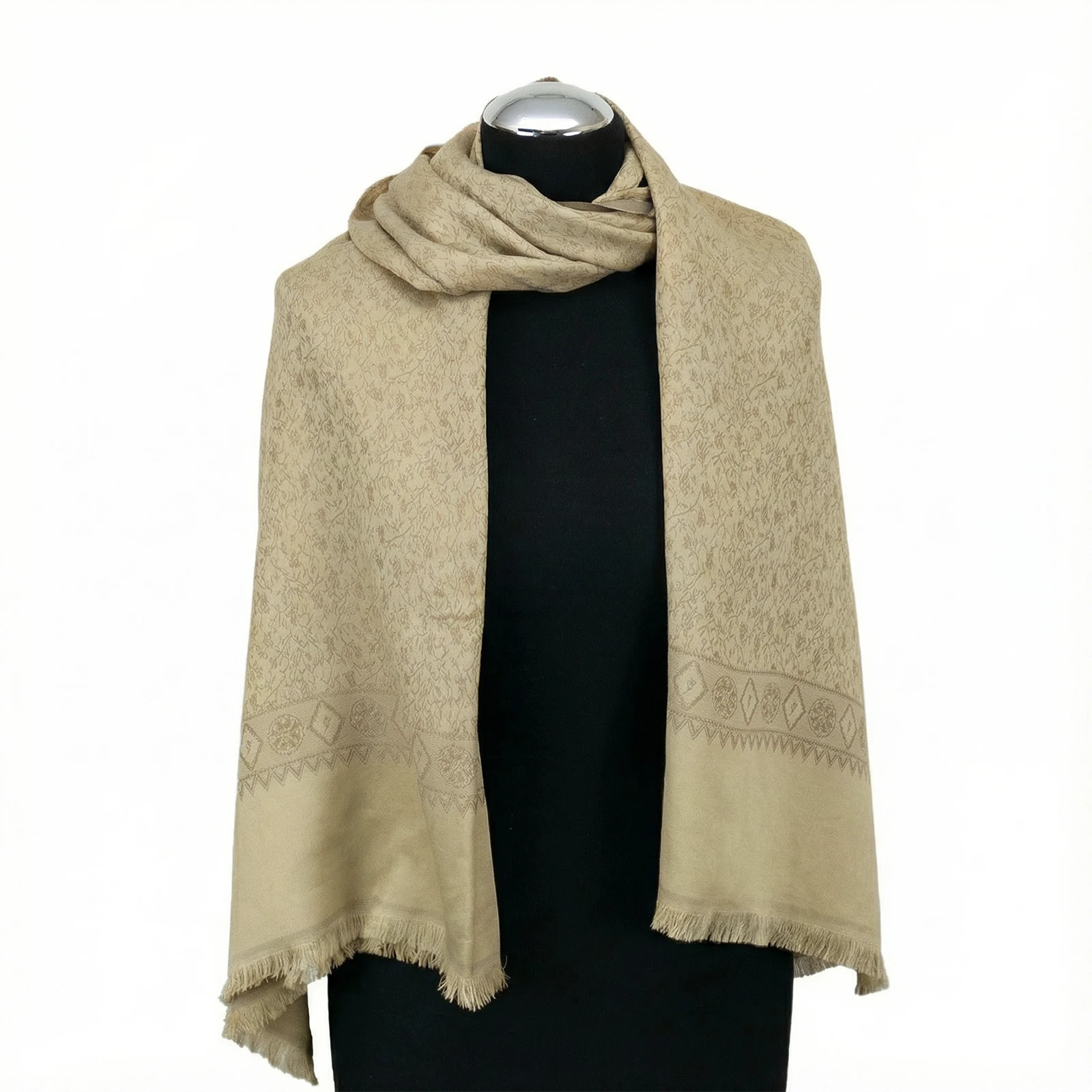 Szal utrzymany jest w jasnej, beżowej tonacji o ciepłym, naturalnym charakterze. Orientalny wzór jest subtelny i równomiernie rozłożony na całej powierzchni materiału, dzięki czemu całość prezentuje się elegancko i spokojnie, bez kontrastów i mocnych akcentów.