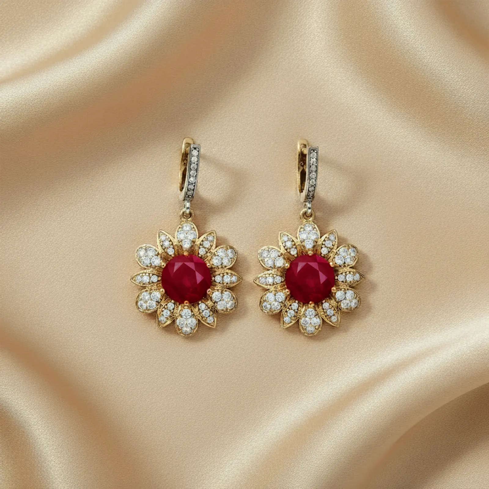 W centrum każdego kolczyka znajduje się rubin o nasyconej czerwonej barwie, otoczony cyrkoniami ułożonymi w kształt płatków. Mocne kontrasty barw i błyszczące wykończenie sprawiają, że kolczyki prezentują się niezwykle okazale.