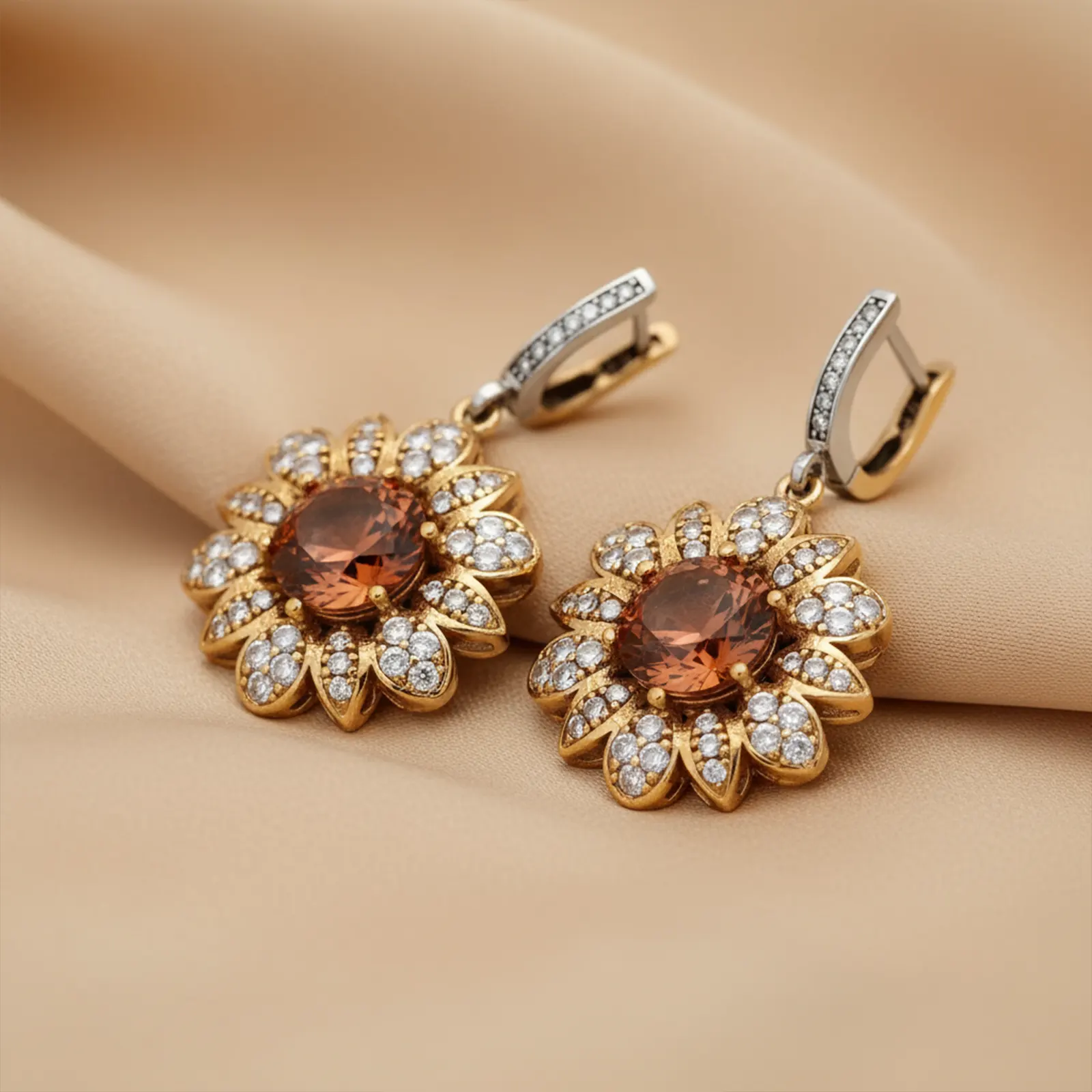 Centralny zultanit zmienia barwę w zależności od światła: w pomieszczeniach oświetlonych jarzeniówkami przybiera zielonkawo-limonkowy ton, w świetle LED przechodzi w brązowy lub brzoskwiniowy, a w świetle dziennym na zewnątrz zyskuje różowawy odcień. Otaczające go cyrkonie podkreślają kształt kwiatu i dodają świetlistego blasku.