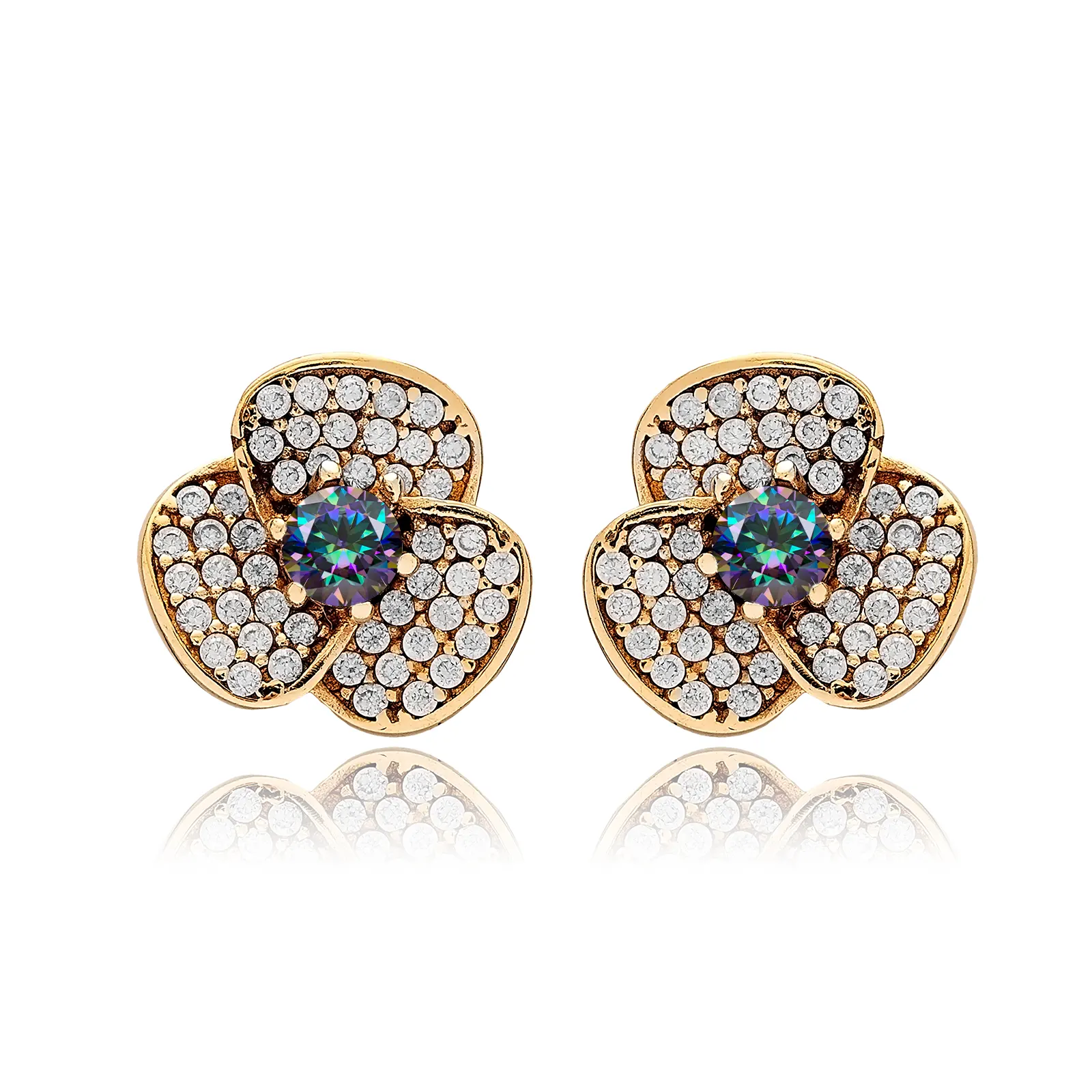 Każdy kolczyk ma formę kwiatu o trzech płatkach, w którego centrum lśni mistyczny topaz - kamień o hipnotyzujących odcieniach zieleni, fioletu i błękitu. Wokół niego rozmieszczono drobne, przezroczyste cyrkonie, które dodają całości elegancji i subtelnego połysku.
