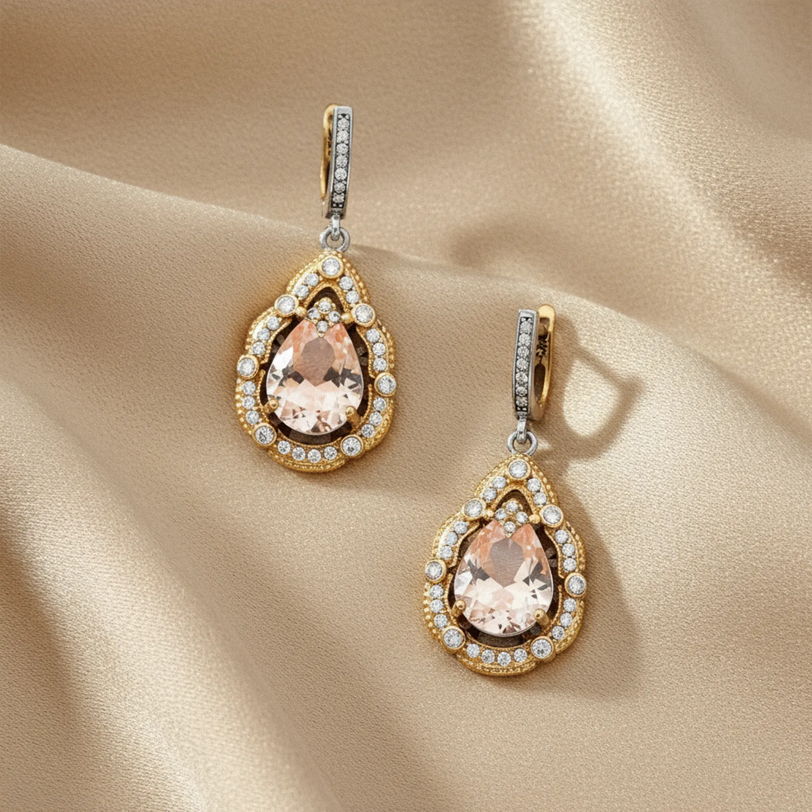 W centralnej części znajduje się morganit o subtelnej, różowej barwie, otoczony błyszczącymi cyrkoniami. Drobne detale wykonane techniką granulacji tworzą finezyjną kompozycję, która podkreśla wyjątkowy charakter biżuterii.