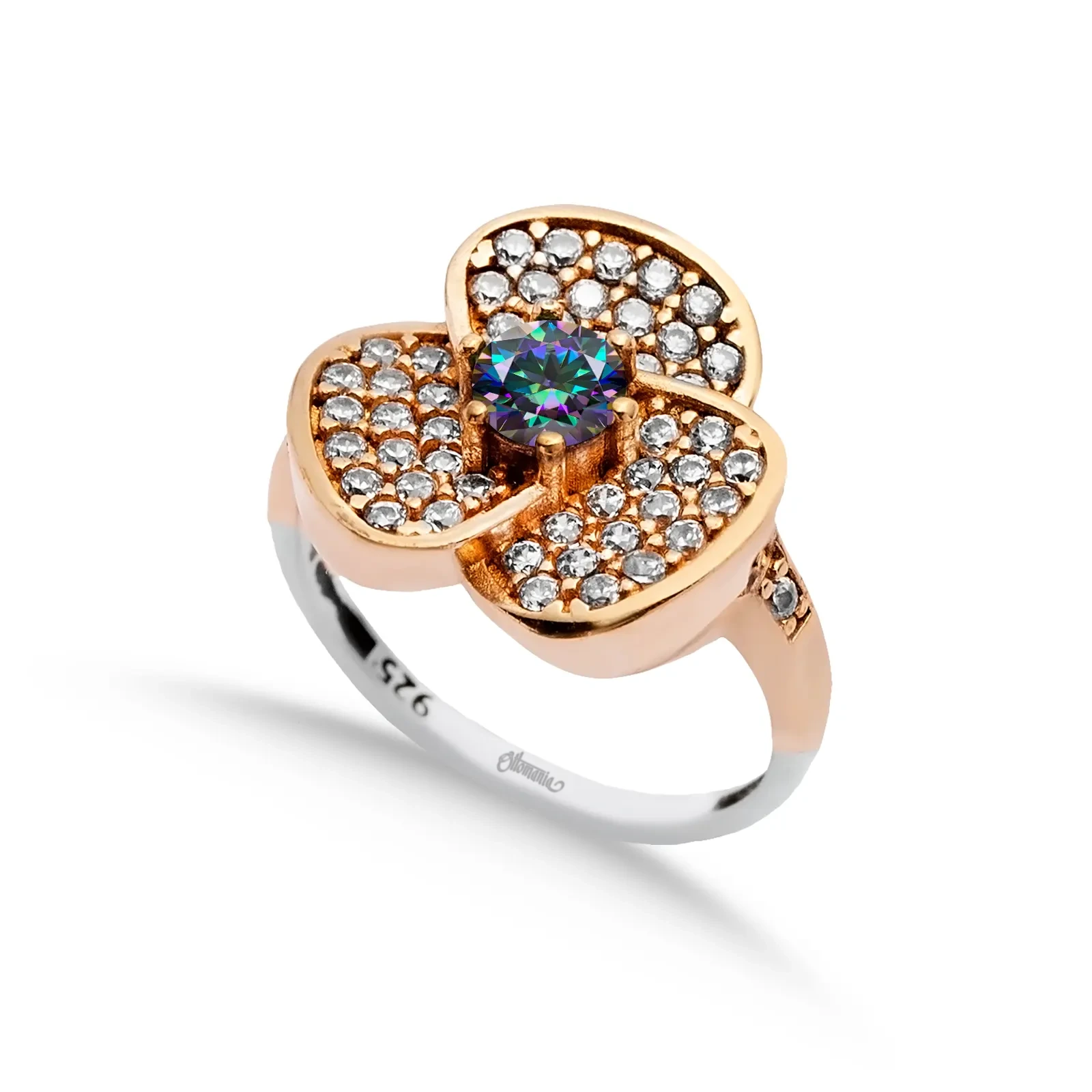 Zestaw składa się z naszyjnika, kolczyków i pierścionka w kształcie kwiatów o trzech płatkach. W centrum każdego elementu umieszczono mistyczny topaz, którego barwy zmieniają się w zależności od światła – od zieleni i błękitu po głęboki fiolet. Wokół kamieni rozmieszczono drobne, przezroczyste cyrkonie, które dodają całości elegancji i blasku.