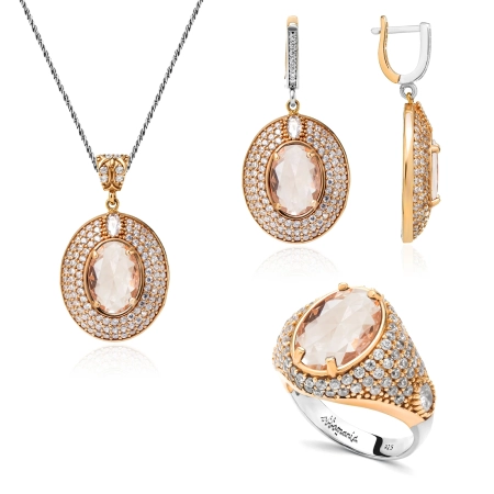 Jeśli marzy Ci się biżuteria, która będzie się cudownie prezentowała na ciele, ale także przyciągała wzrok to ten komplet srebrny z morganitem w stylu ottomańskim będzie doskonałym wyborem. W pierścieniu, kolczykach i naszyjniku osadzony został morganit o kształcie i szlifie "owalnym". Dodatkowo umieszczono cyrkonie, które rozświetlają kamień. Komplet wykonany jest ze srebra najwyższej próby - 925 z dodatkiem brązu, który nadaje orientalnego charakteru. Srebro zostało zabezpieczone rodem (srebro rodowane) w celu ochrony przed zarysowaniami oraz ciemnieniem.