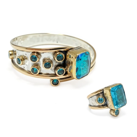 Komplet tworzy duet, który wygląda jak zestaw odnaleziony na orientalnym bazarze - pełen charakteru, barwy i artystycznego wykończenia. Zarówno w bransoletce, jak i pierścionku główną rolę odgrywa błękitny topaz o prostokątnym szlifie, który przyciąga wzrok swoim nasyconym, głębokim kolorem.
