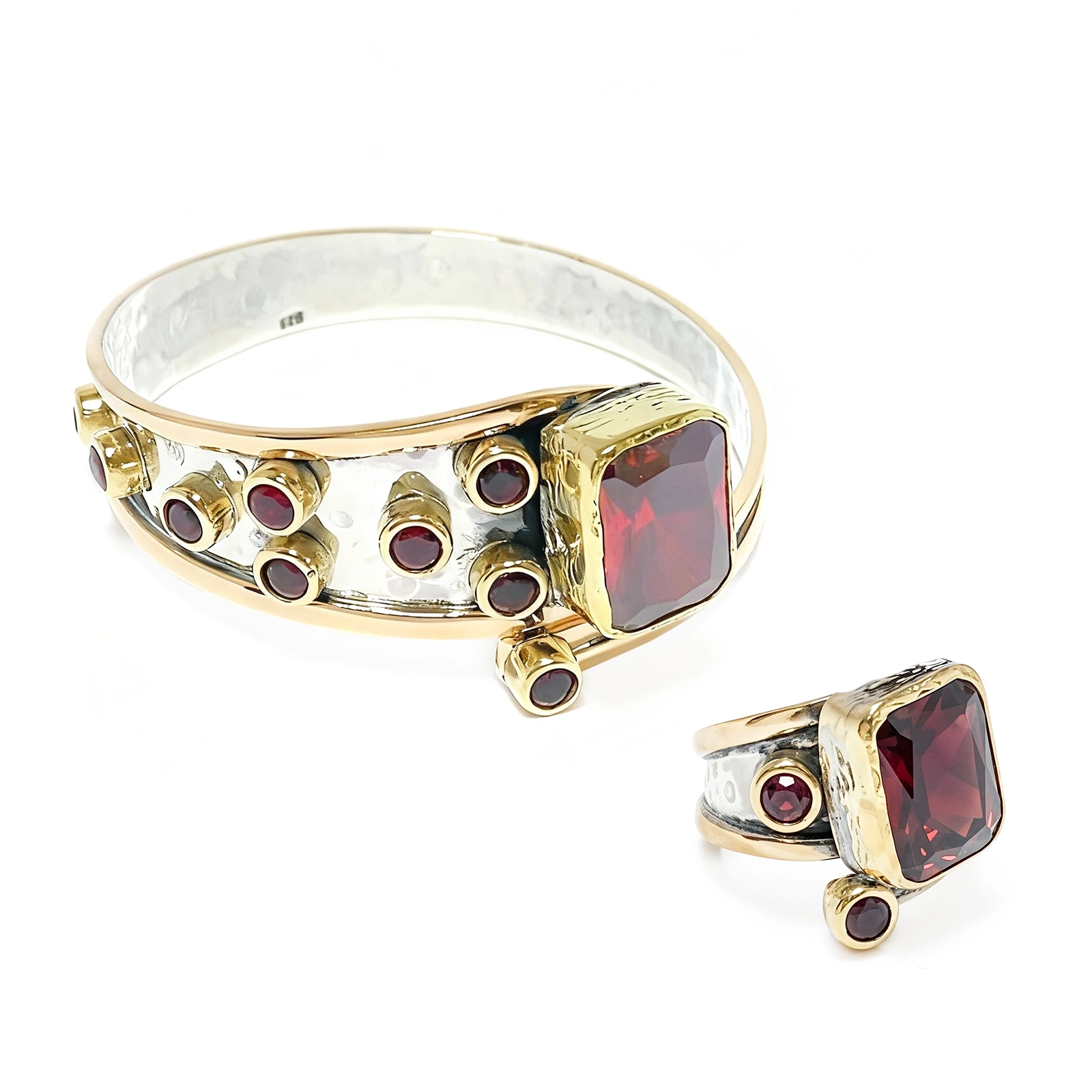 Kompozycję uzupełniają mniejsze granaty o okrągłym szlifie, rozmieszczone na postarzanej młotkowanej powierzchni metalu. Oba elementy mają otwartą konstrukcję, co pozwala na regulację i idealne dopasowanie do dłoni.