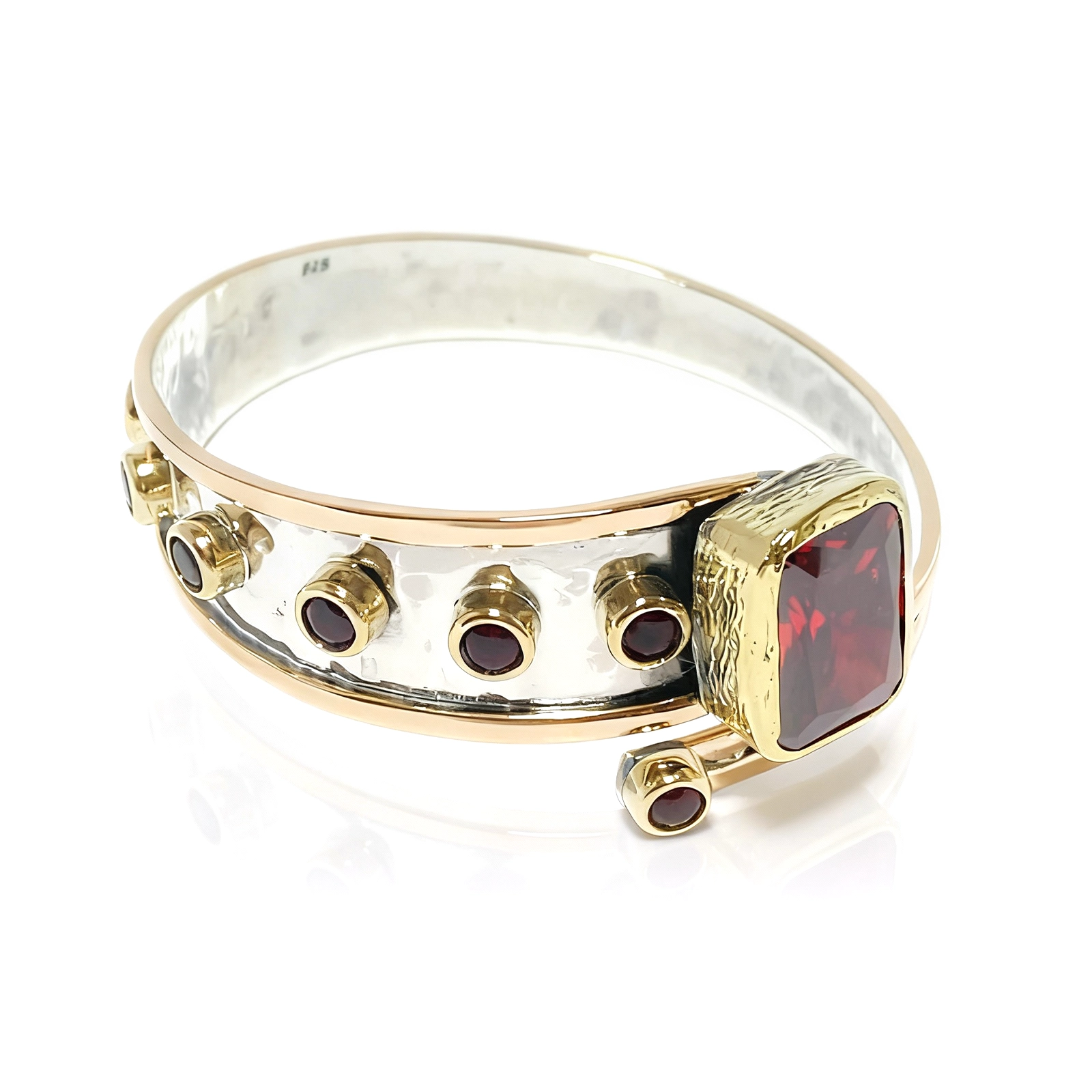 Kompozycję uzupełniają mniejsze granaty o okrągłym szlifie, rozmieszczone na postarzanej młotkowanej powierzchni metalu. Oba elementy mają otwartą konstrukcję, co pozwala na regulację i idealne dopasowanie do dłoni.