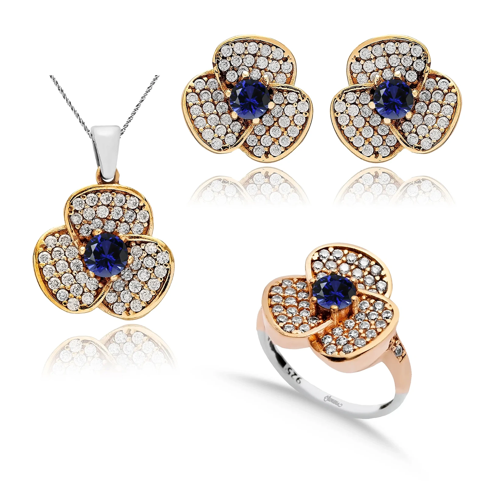 Zestaw obejmuje naszyjnik, kolczyki i pierścionek w formie kwiatów o trzech płatkach. Centralny element każdego z nich to szafir - kamień symbolizujący spokój, lojalność i wewnętrzną siłę. Otaczające go przezroczyste cyrkonie pięknie odbijają światło, tworząc wyjątkowy efekt głębi i blasku.