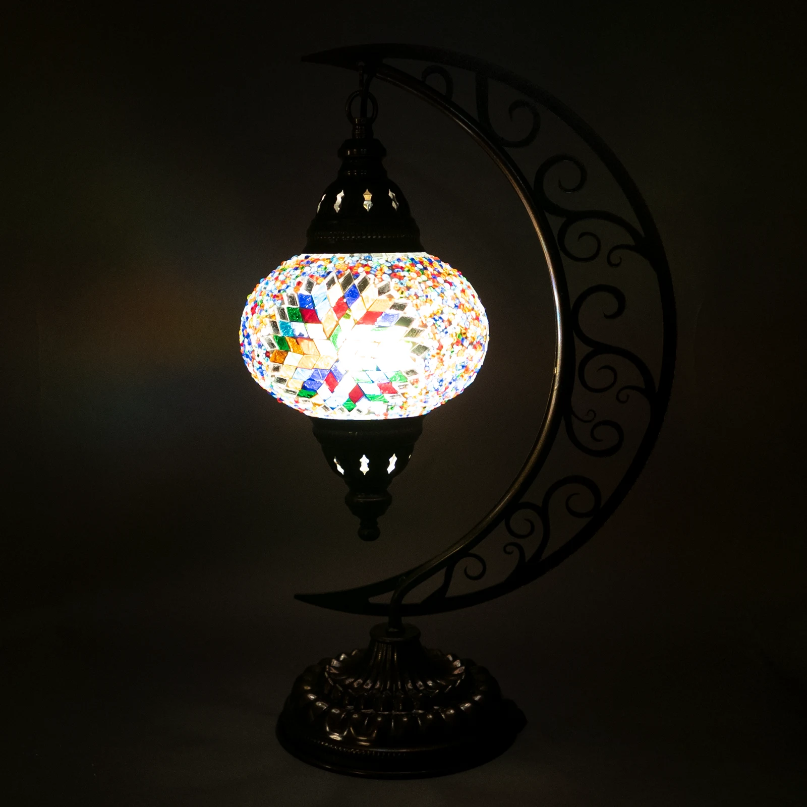 Lampa mozaikowa z kolekcji Adana to wyjątkowy element dekoracyjny, który wprowadza do wnętrza żywe barwy i orientalny charakter. Jej klosz, starannie wykonany z wielokolorowych szkiełek, tworzy fascynującą grę świateł, rozświetlając przestrzeń różnorodnymi odcieniami. Ażurowy stelaż w kształcie księżyca dodaje lampie subtelnej elegancji, czyniąc ją doskonałym wyborem dla osób szukających unikalnych akcentów w aranżacji wnętrz.