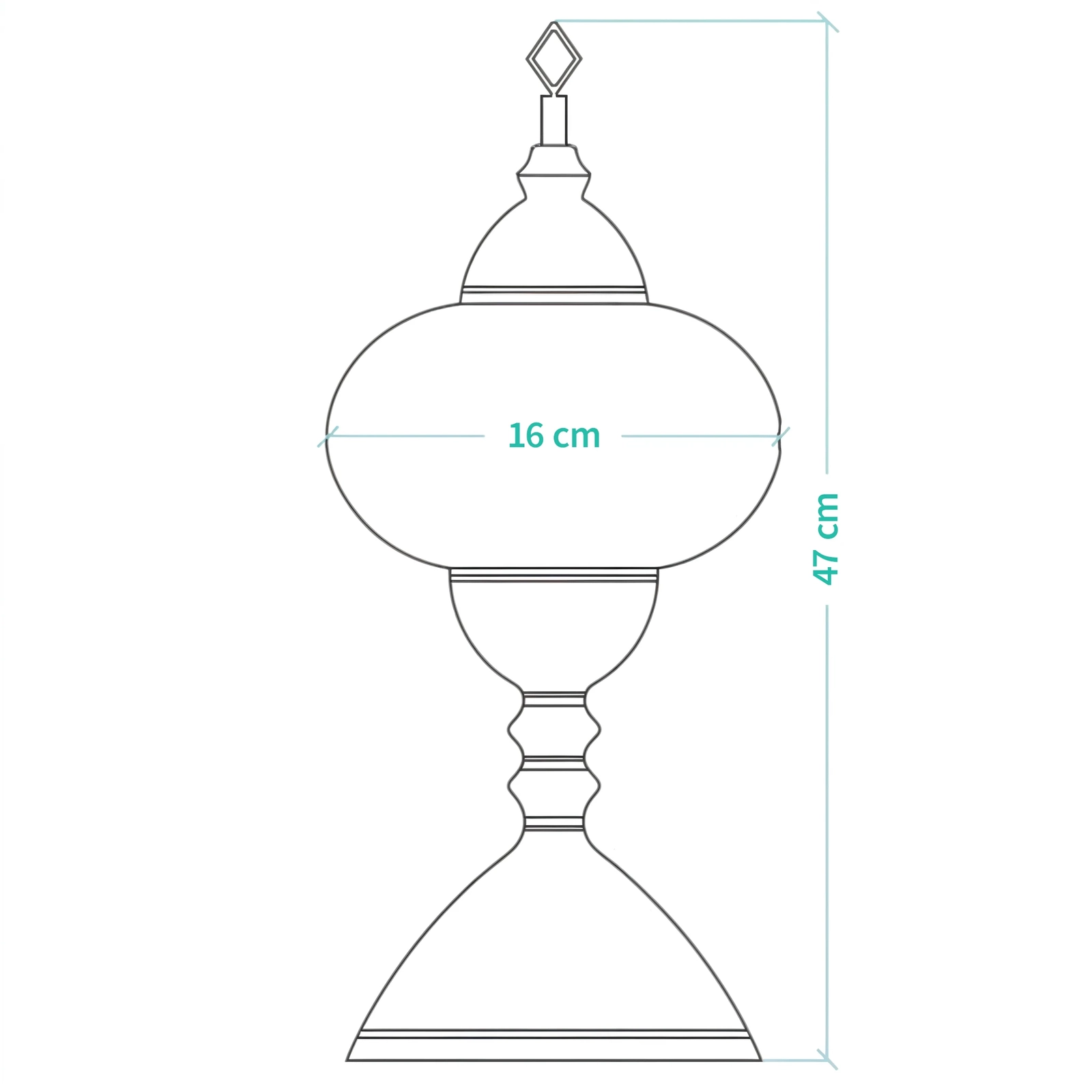 Cały proces ozdabiania lampy przebiega w formie pracy ręcznej. Właśnie z tego powodu każdy egzemplarz jest inny, niepowtarzalny. Do zdobienia klosza przygotowuje się tafle różnokolorowego szkła. Osoba uczestnicząca w procesie produkcji lampy tnie takie tafle najpierw na paski, następnie na małe figury geometryczne. W dalszej kolejności wycięte ze szkła figury (np. kwadraty, romby, prostokąty) przyklejane są na powierzchni przezroczystego szklanego klosza w formie fantazyjnych wzorów mozaiki. Do przyklejenia wzoru, a następnie wykończenia klosza, używany jest silikon bądź gips - wszystko w zależności od modelu. Następnie klosz jest umieszczany w metalowym stelażu, który także ozdobiony jest przepięknymi orientalnymi wzorami. Tak właśnie tworzone są nasze bajecznie kolorowe tureckie lampy. Lampa dzięki swojej konstrukcji oraz zdobieniu doskonale oddaje orientalny charakter kraju, z którego została sprowadzona - Turcji.