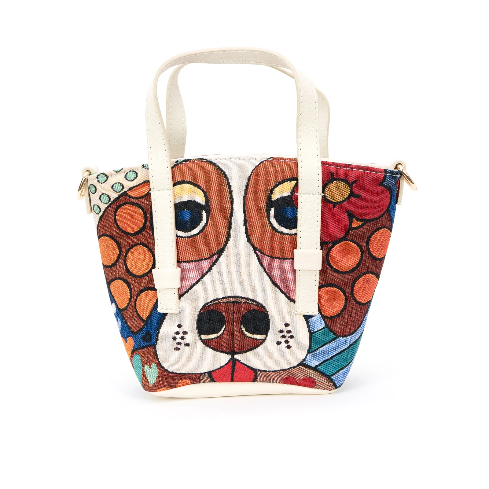 Mała torebka typu kuferek (mini bag) łączy ekoskórę z wyrazistą tkaniną gobelinową, na której widnieje zabawny, kolorowy pies z dużymi oczami i dekoracyjnym tłem. Połączenie barwnych detali i artystycznego wzoru nadaje jej niepowtarzalnego charakteru i humorystycznego uroku.
