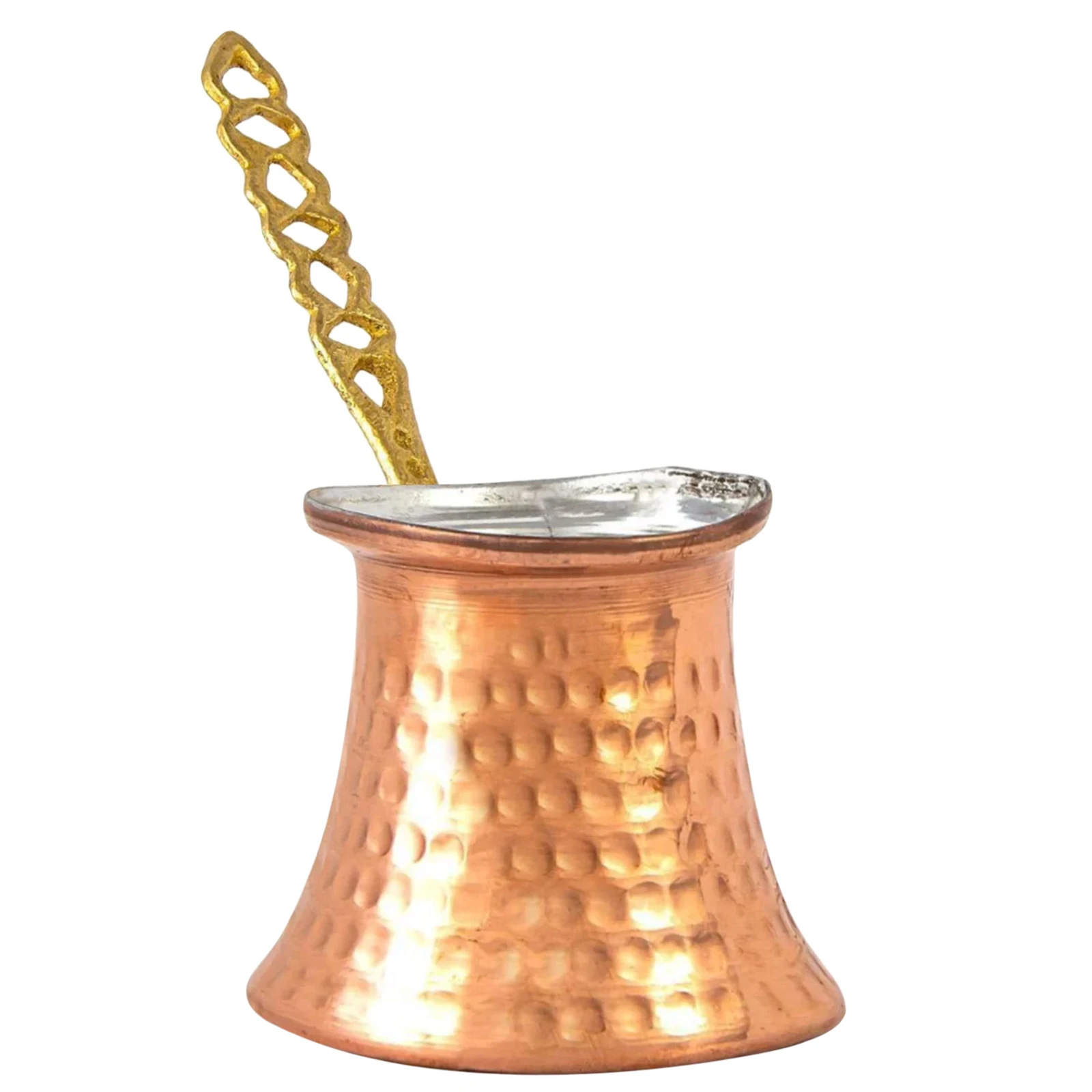 Klasyczny miedziany tygielek o pojemności 450 ml to doskonały wybór dla miłośników tradycyjnej kawy po turecku. Wykonany z litej miedzi i pokryty wewnątrz warstwą cyny, gwarantuje równomierne rozprowadzanie ciepła, dzięki czemu kawa zachowuje głębię smaku i piękną piankę.