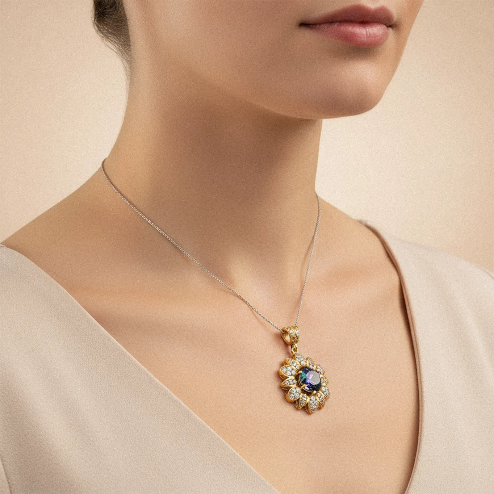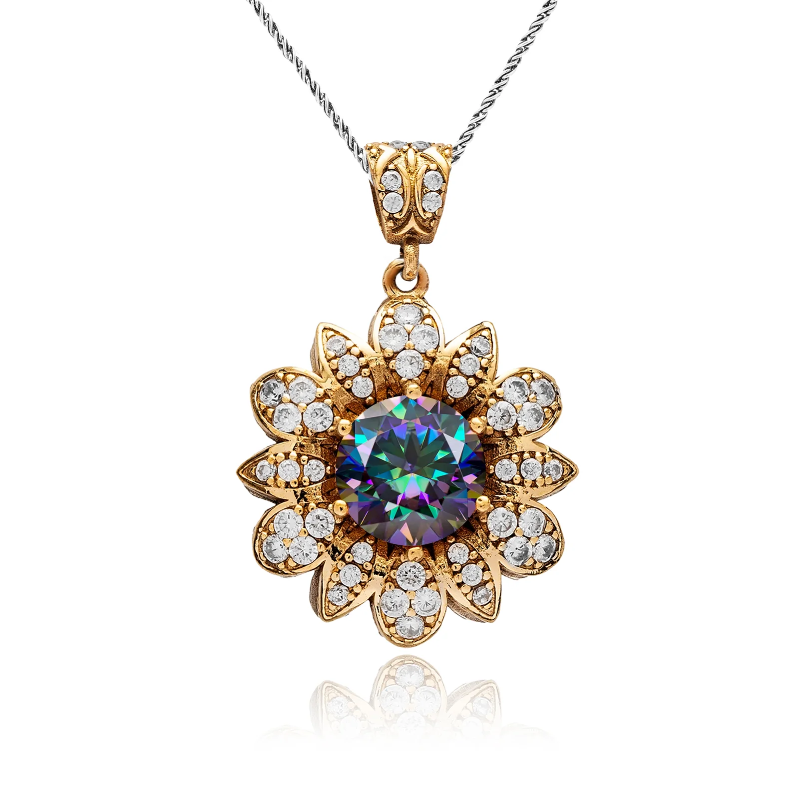 Centralny mistyczny topaz mieni się w świetle odcieniami zieleni, błękitu i fioletu, tworząc spektakularny efekt tęczowego połysku. Otaczające go cyrkonie układają się w symetryczny motyw kwiatowy, który dodaje biżuterii majestatycznego wyglądu.