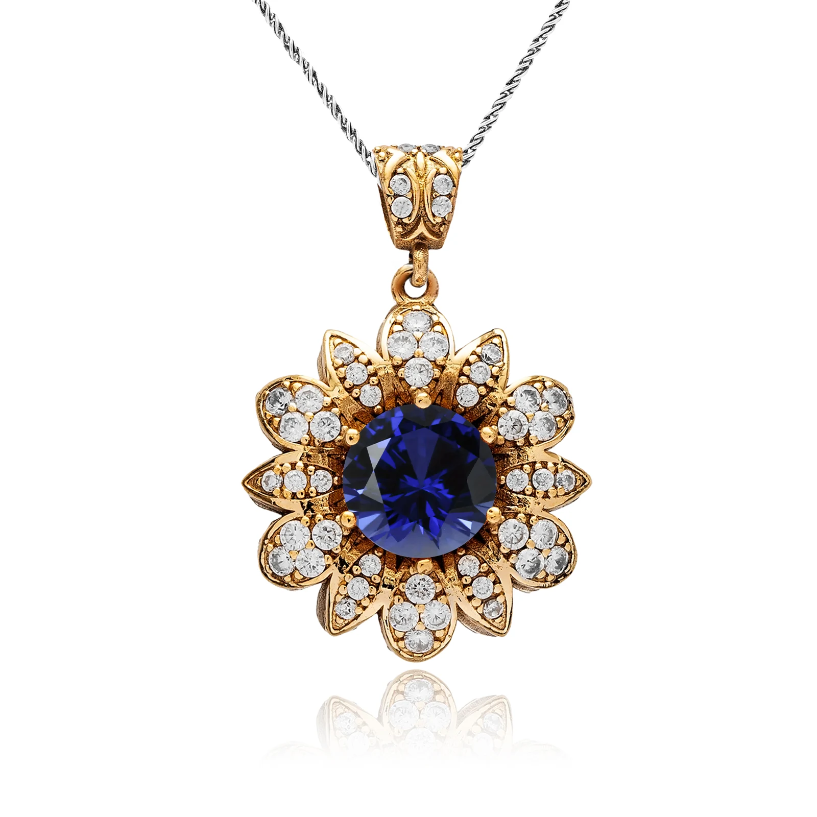 Naszyjnik srebrny w kształcie kwiatu z szafirem i cyrkoniami