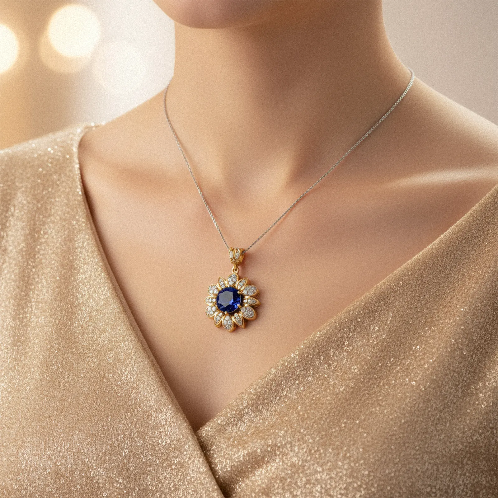 Naszyjnik srebrny z szafirem to efektowna biżuteria w orientalnym stylu, wykonana z połączenia srebra próby 925 i brązu. Zachwyca bogactwem formy i głębią koloru, tworząc wrażenie prawdziwego klejnotu.