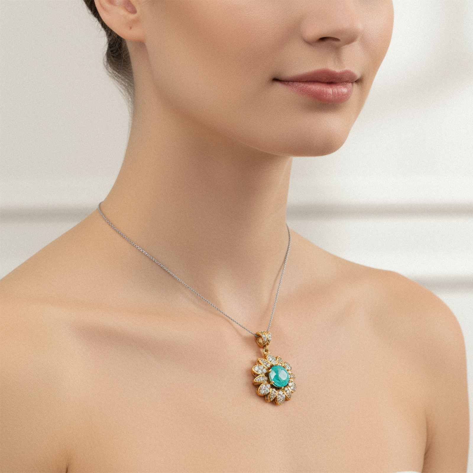 W centrum zawieszki znajduje się turmalin paraiba o głębokiej, zielonej barwie i delikatnych spękaniach wewnątrz, które sprawiają, że każdy kamień jest unikalny. Otaczające go cyrkonie tworzą efekt promiennego kwiatu, który pięknie odbija światło.