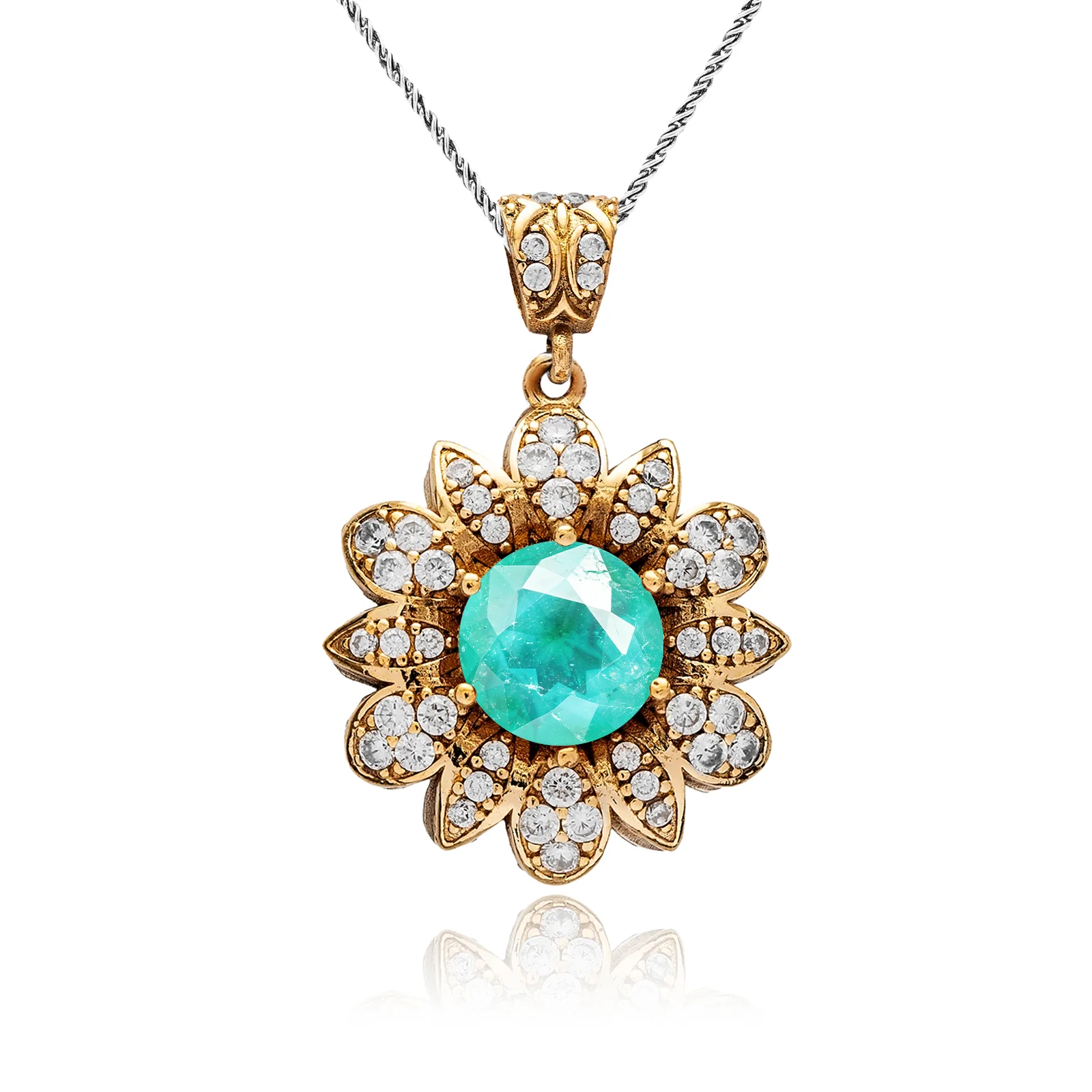 Nowość Naszyjnik srebrny w kształcie kwiatu z zielonym turmalinem paraiba i cyrkoniami