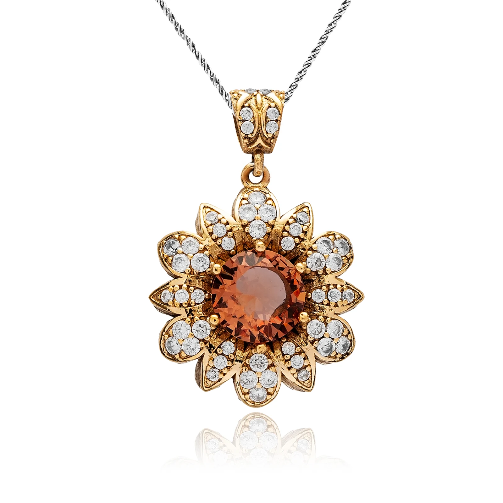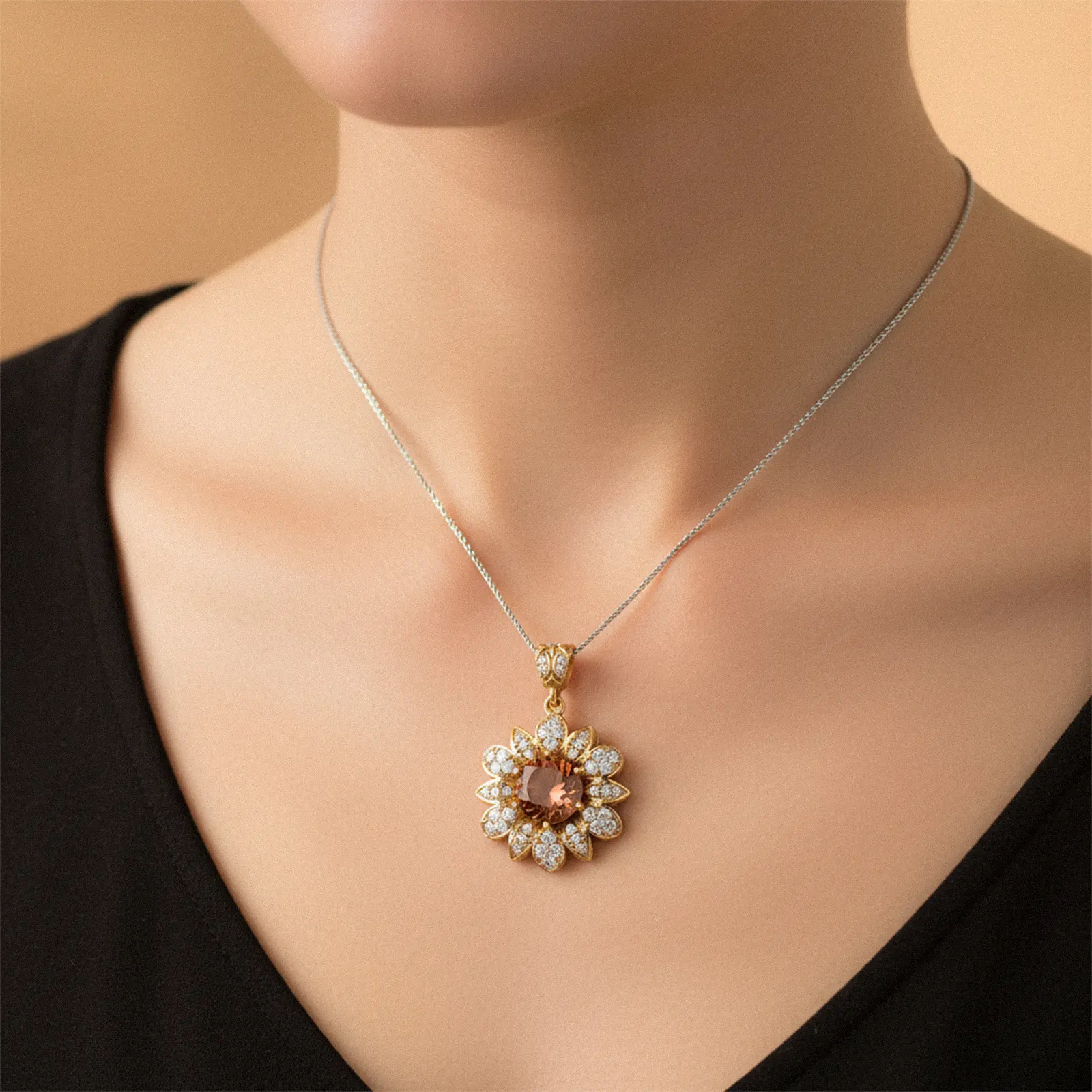 W centrum zawieszki umieszczono zultanit, który reaguje na zmianę oświetlenia. W świetle jarzeniowym przybiera limonkowo-zieloną barwę, w świetle LED mieni się ciepłymi brązowymi i brzoskwiniowymi tonami, a w naturalnym świetle dziennym zaskakuje różowawym odcieniem. Kamień otaczają cyrkonie, które rozświetlają całość niczym promienie słońca.