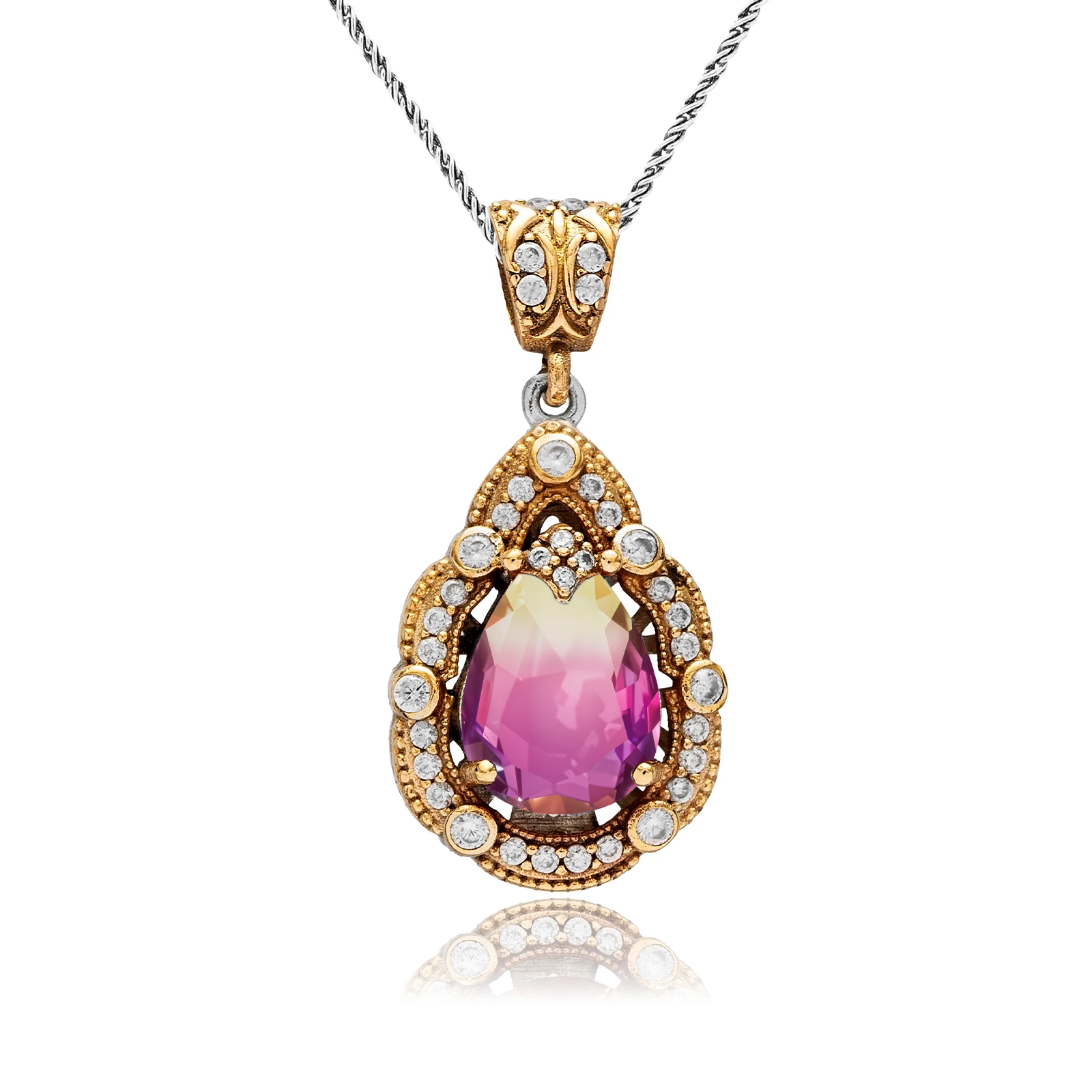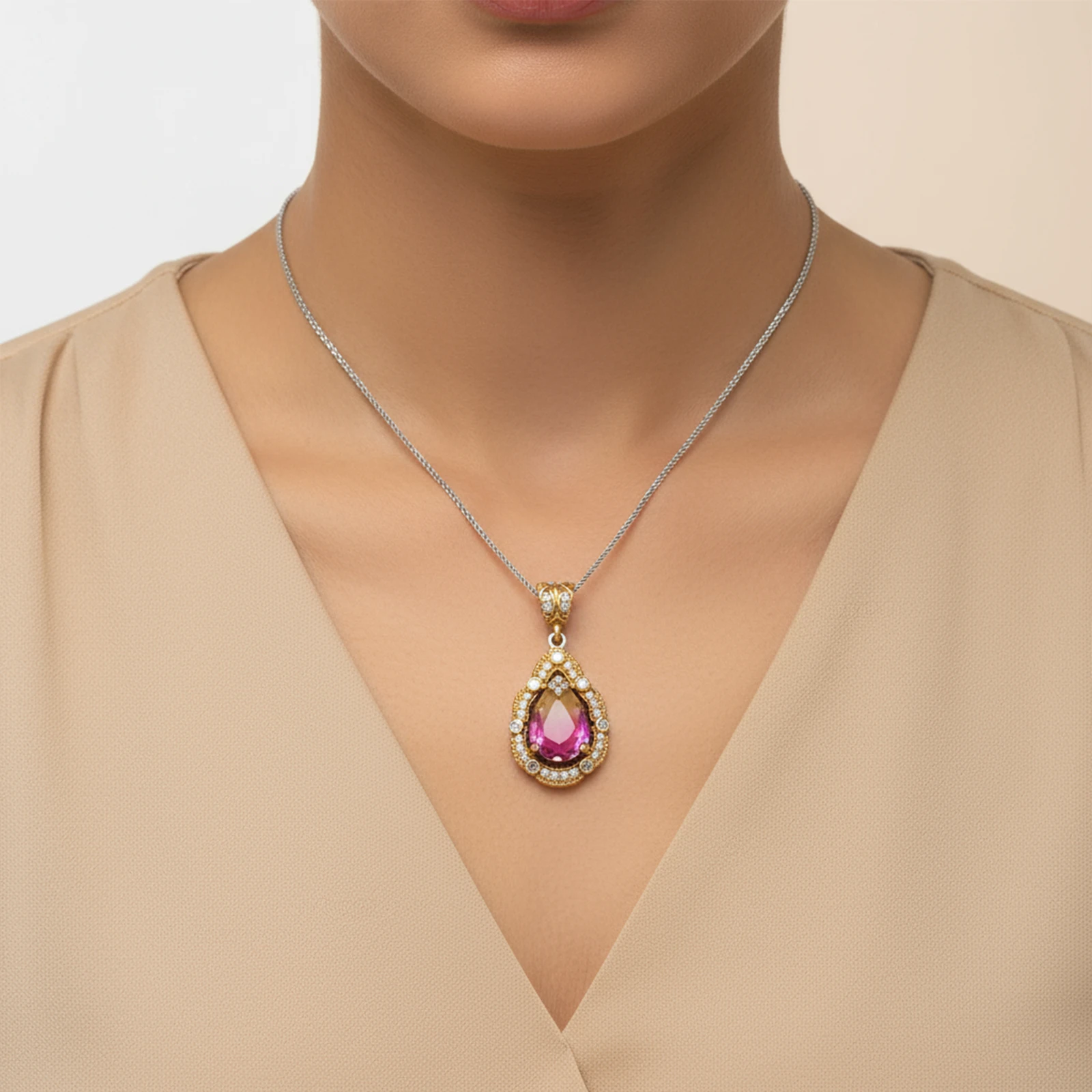 W centrum kompozycji znajduje się ametryn - kamień o dwukolorowym odcieniu różu i fioletu, otoczony połyskującymi cyrkoniami. Drobne detale w formie ziarnistej faktury tworzą efekt granulacji, który podkreśla artystyczny charakter naszyjnika.