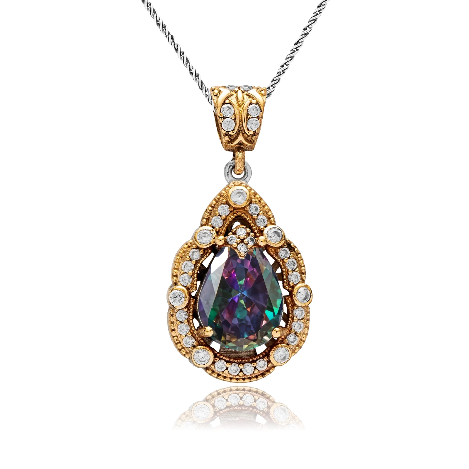W centrum zawieszki znajduje się mistyczny topaz, którego barwy zmieniają się w zależności od światła - od fioletu i zieleni po błękitne refleksy. Drobne cyrkonie dodają mu świetlistości, a granulacja w oprawie podkreśla rękodzielniczy charakter biżuterii.