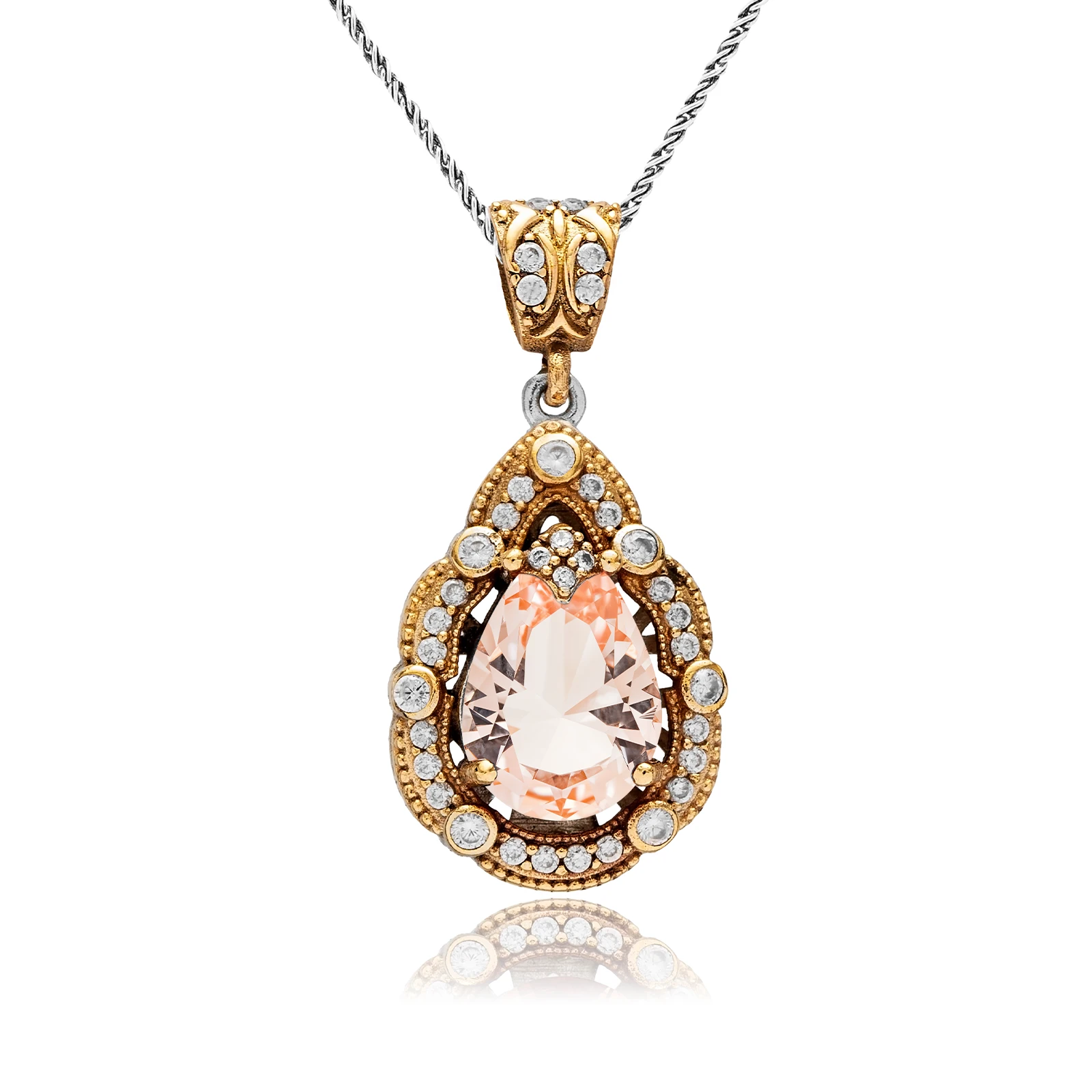 Naszyjnik srebrny z morganitem to wyjątkowa biżuteria o romantycznym charakterze. Wykonany z połączenia srebra próby 925 i brązu, zachwyca subtelnym kolorem kamienia i bogatym zdobieniem w orientalnym stylu.