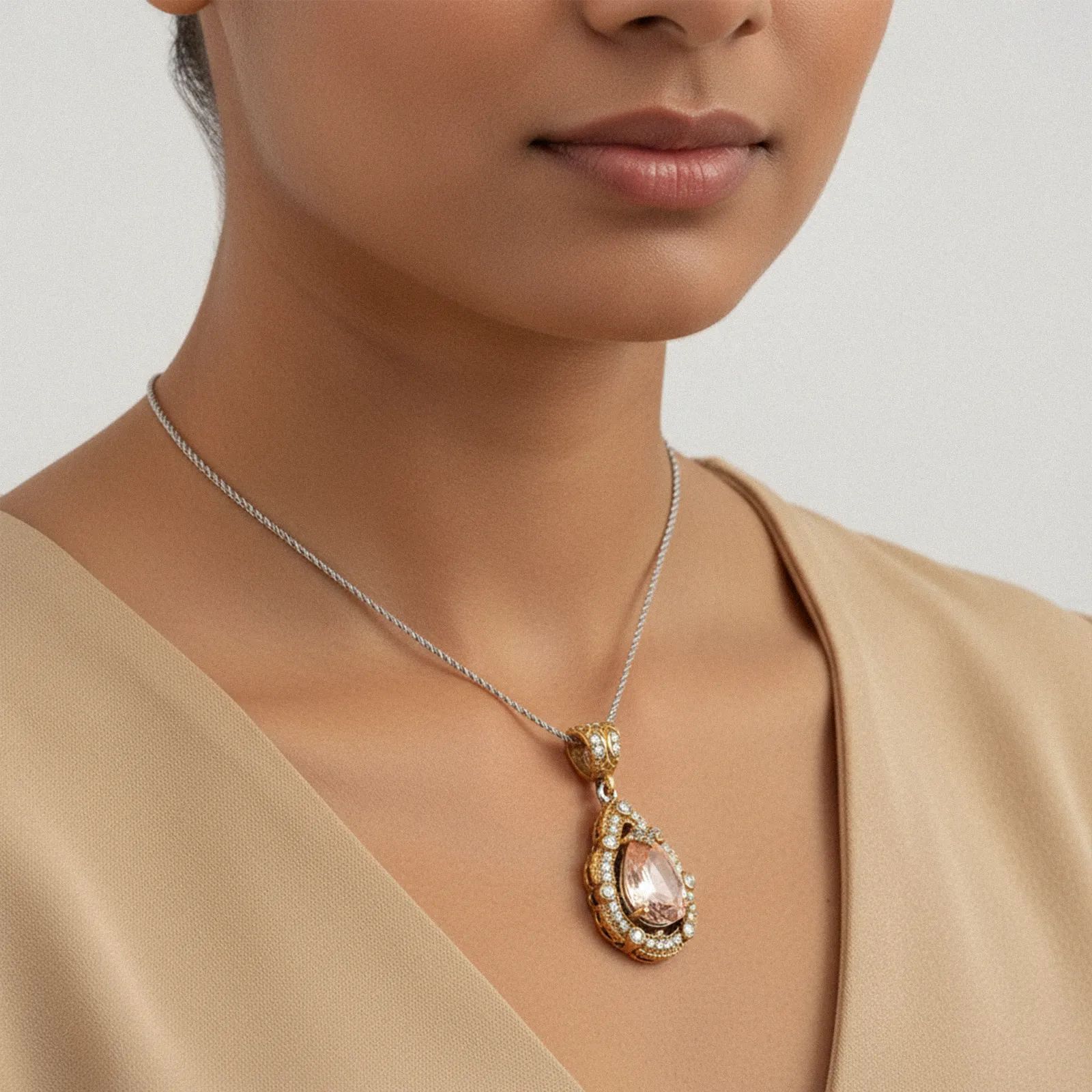 W centrum zawieszki znajduje się morganit o ciepłym, różowo-brzoskwiniowym odcieniu, otoczony połyskującymi cyrkoniami. Delikatna granulacja dodaje całości szlachetnej faktury i podkreśla ręczne wykonanie.