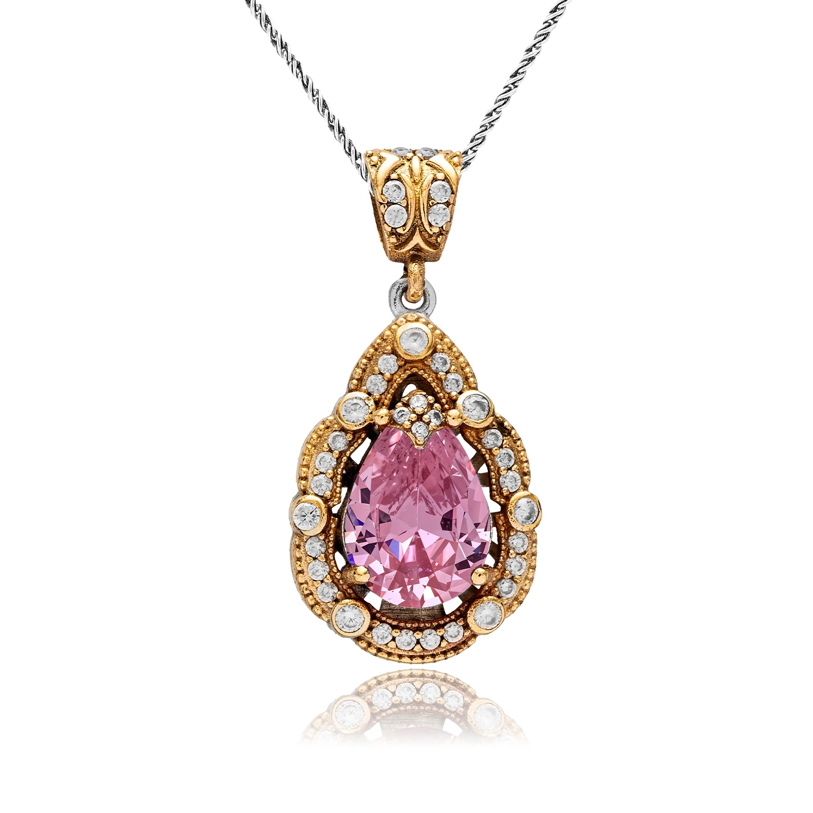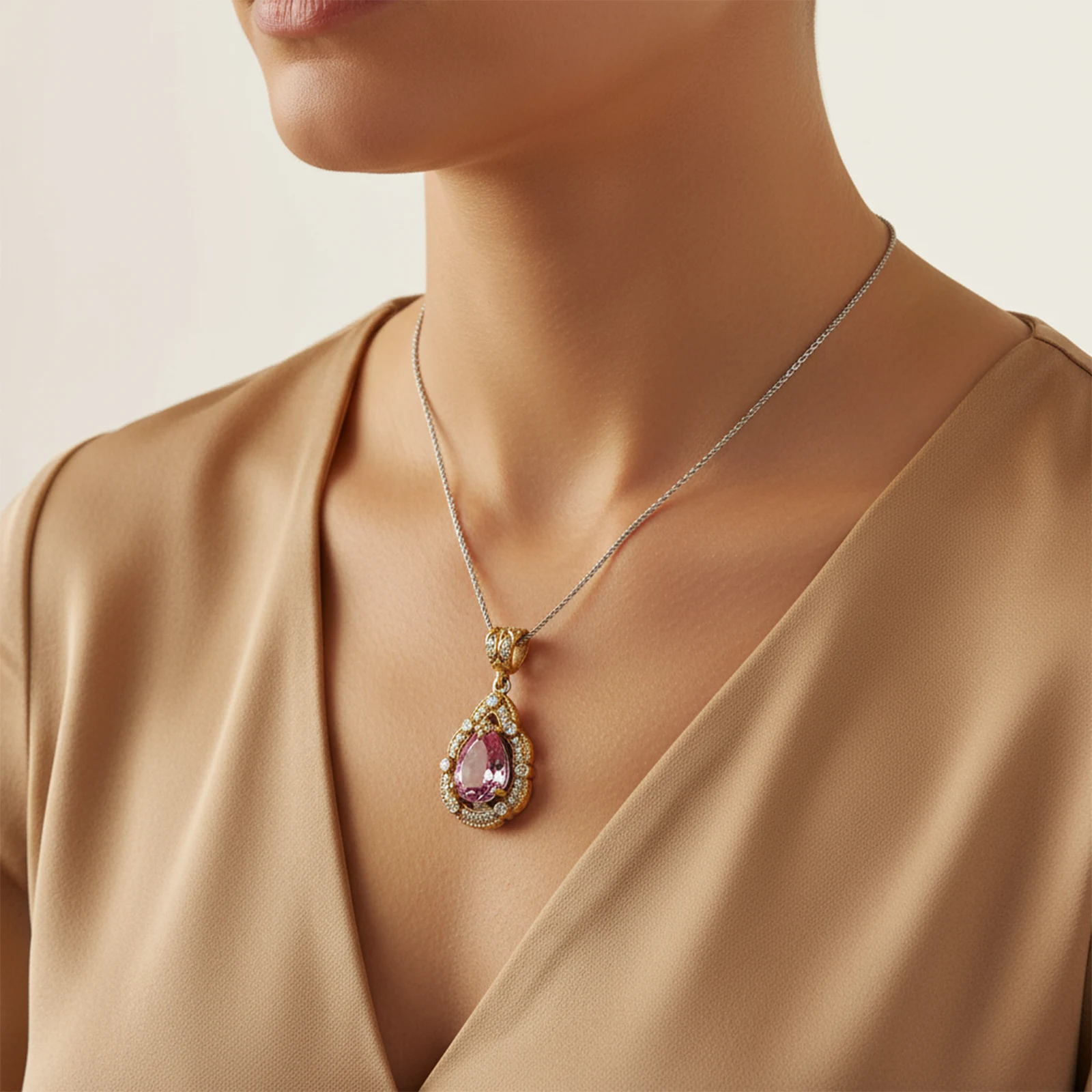 Naszyjnik srebrny z różowym topazem to biżuteria, która łączy delikatność z orientalnym charakterem. Wykonany z połączenia srebra próby 925 i brązu, przyciąga uwagę swoim romantycznym odcieniem i perfekcyjnym wykończeniem.