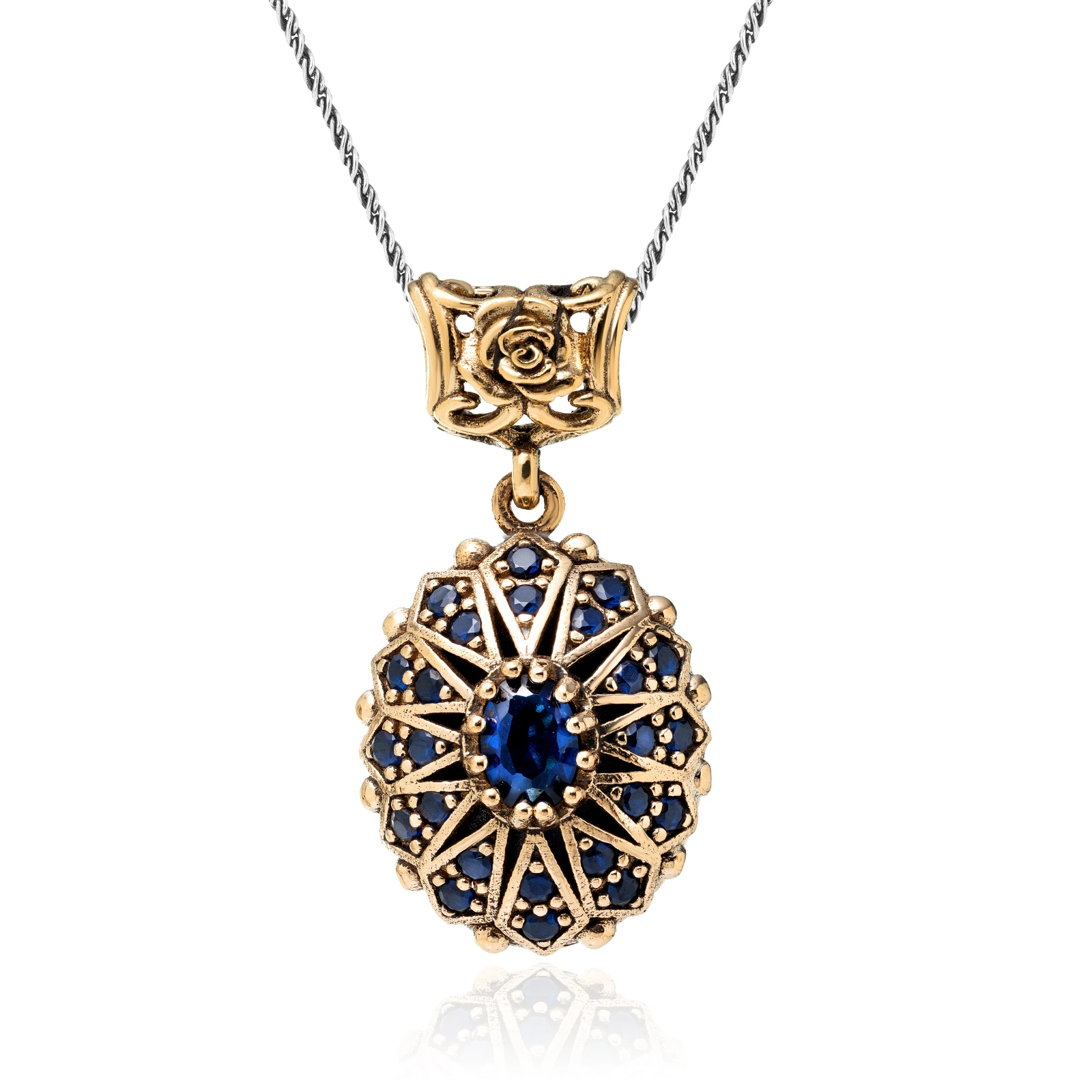 Naszyjnik w orientalnym stylu z szafirem i cyrkoniami to wyjątkowa biżuteria o bogatym zdobieniu i wyrazistym charakterze. Jego centralnym elementem jest owalna zawieszka z głęboko niebieskim szafirem, otoczonym zdobieniem w formie gwiezdnej kompozycji. Dodatkowe, mniejsze cyrkonie w odcieniach niebieskiego harmonijnie dopełniają całość. Nad zawieszką umieszczono ozdobny element z motywem róży, który dodaje naszyjnikowi subtelnej elegancji. Wykonany ze srebra próby 925 i pokryty brązem, wyróżnia się ciepłym, miedzianym odcieniem. To doskonały wybór dla osób ceniących egzotyczne akcenty i oryginalne detale.