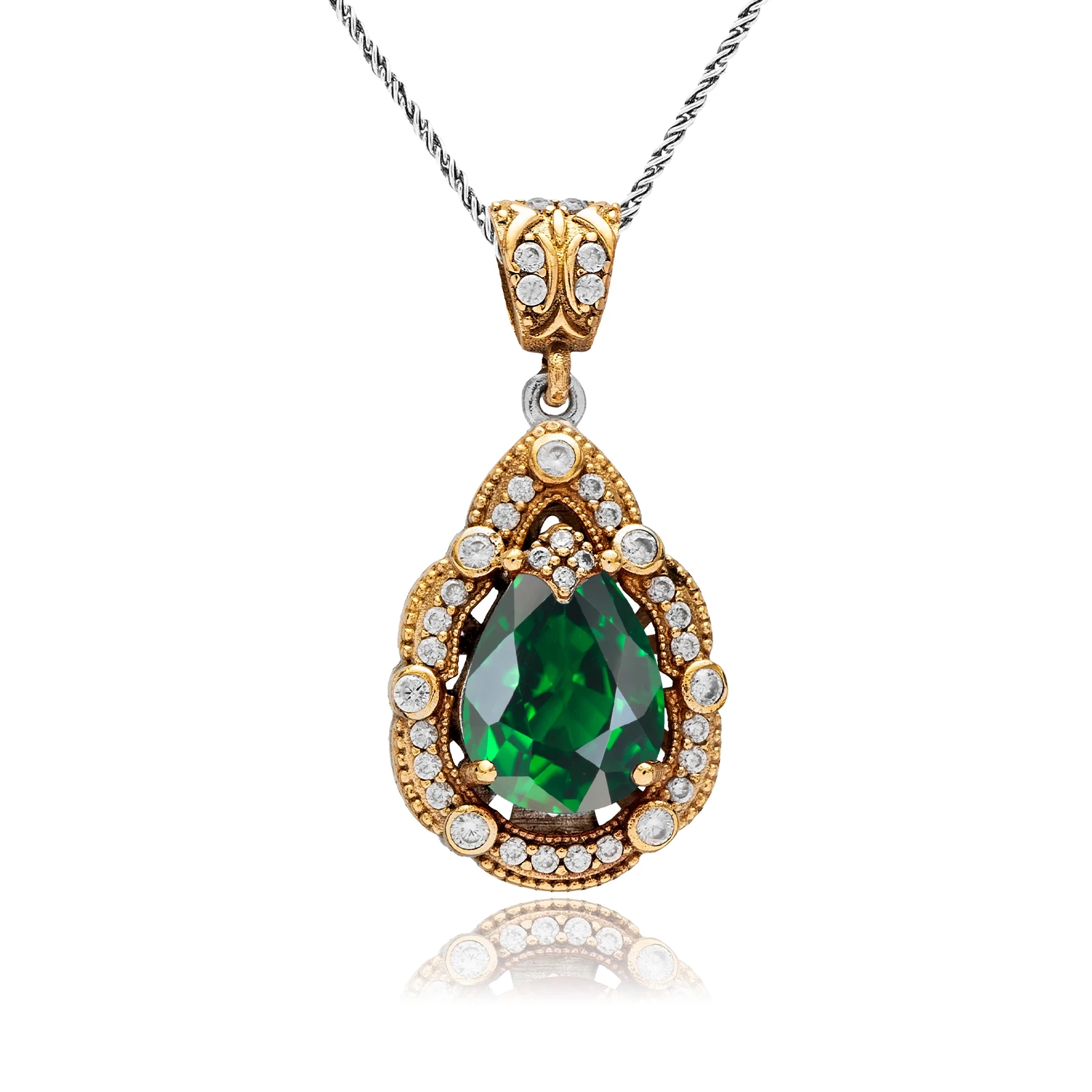 Naszyjnik srebrny ze szmaragdem to biżuteria pełna klasy i orientalnego uroku. Wykonany z połączenia srebra próby 925 i brązu, zachwyca precyzyjnym wykonaniem i szlachetnym kolorem kamienia.