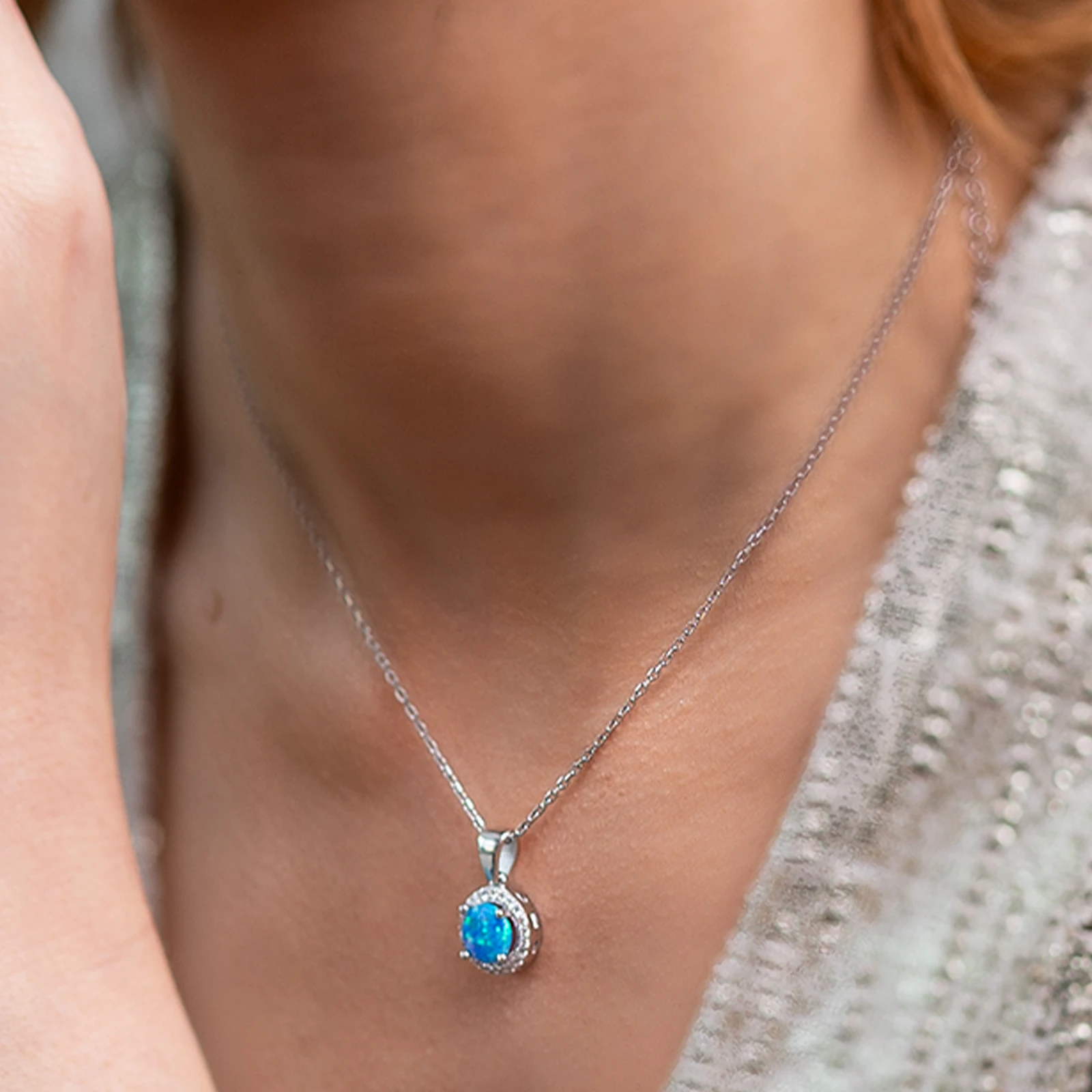 Ten elegancki naszyjnik ze srebra ozdobiony jest opalem australijskim o okrągłym szlifie kaboszonowym, który przyciąga wzrok swoją subtelną grą kolorów. Opal otacza delikatny rząd błyszczących cyrkonii, dodających całości blasku i elegancji. Kamień jest pewnie osadzony w czterech krapach, które subtelnie podkreślają jego piękno. Naszyjnik łączy w sobie klasyczną formę z nowoczesnymi akcentami, stanowiąc doskonały wybór na specjalne okazje.