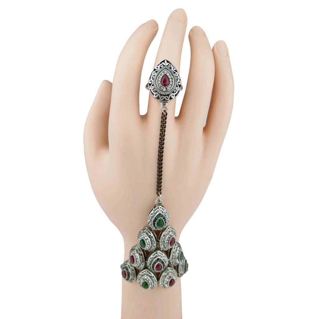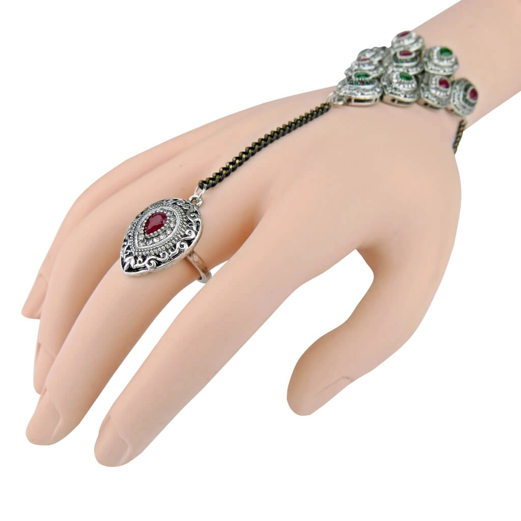 Orientalna bransoletka z pierścionkiem - rzadko spotykana bransoletka, w której bransoleta połączona jest łańcuszkiem z pierścieniem. Jest to bardzo charakterystyczna bransoletka, którą bardzo upodobały sobie kobiety zakochane w oriencie. Ta orientalna biżuteria niezawodnie podkreśla kobiece dłonie oraz wizualnie wydłuża palce, co sprawia, że jest biżuterią niezastąpioną, wręcz idealną. Jej forma wykonania jest niezwykle bogata, ponieważ zawiera w sobie nie tylko bransoletkę, ale również pierścionek. Piękne cyrkonie rozświetlają ją, dzięki czemu orientalna bransoletka z pierścionkiem będzie podkreślała Twoją urodę jak żadna inna. Wszystko to sprawia, że orientalna bransoletka z pierścionkiem to najlepszy wybór właśnie dla Ciebie.