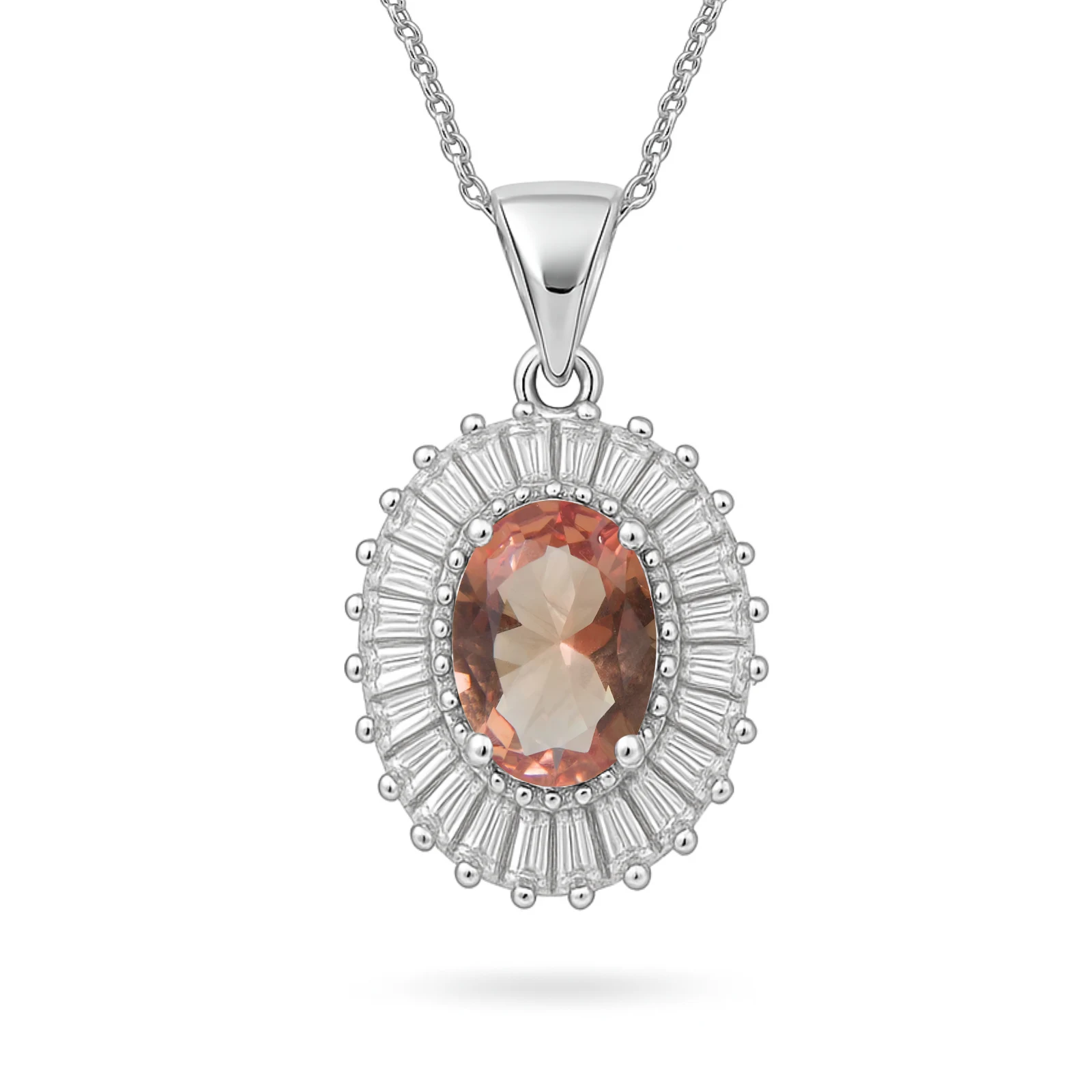 Naszyjnik wykonany z najwyższej jakości srebra, ozdobiony imponującym owalnym zultanitem otoczonym starannie osadzonymi cyrkoniami w formie bagietu prostokątnego. Promienista kompozycja kamieni podkreśla unikalne właściwości zultanitu, który zmienia barwę w zależności od światła. Elegancki i wyrafinowany, stanowi doskonały wybór dla osób ceniących oryginalną i pełną blasku biżuterię. Idealny na wyjątkowe okazje lub jako wyróżniający się dodatek na co dzień.