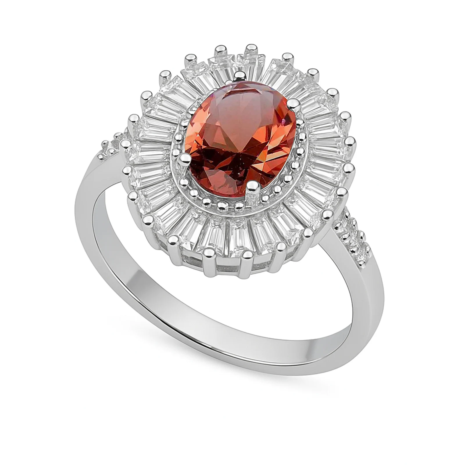 Pierścionek wykonany z najwyższej jakości srebra, którego centralnym punktem jest zachwycający owalny zultanit - kamień o wyjątkowej zdolności zmiany barwy. Wokół niego starannie osadzone prostokątne cyrkonie w formie bagietu tworzą promienistą kompozycję, nadając całości eleganckiego blasku. Wyjątkowy wybór dla miłośniczek biżuterii pełnej klasy i subtelnego uroku, idealny zarówno na specjalne okazje, jak i na co dzień.