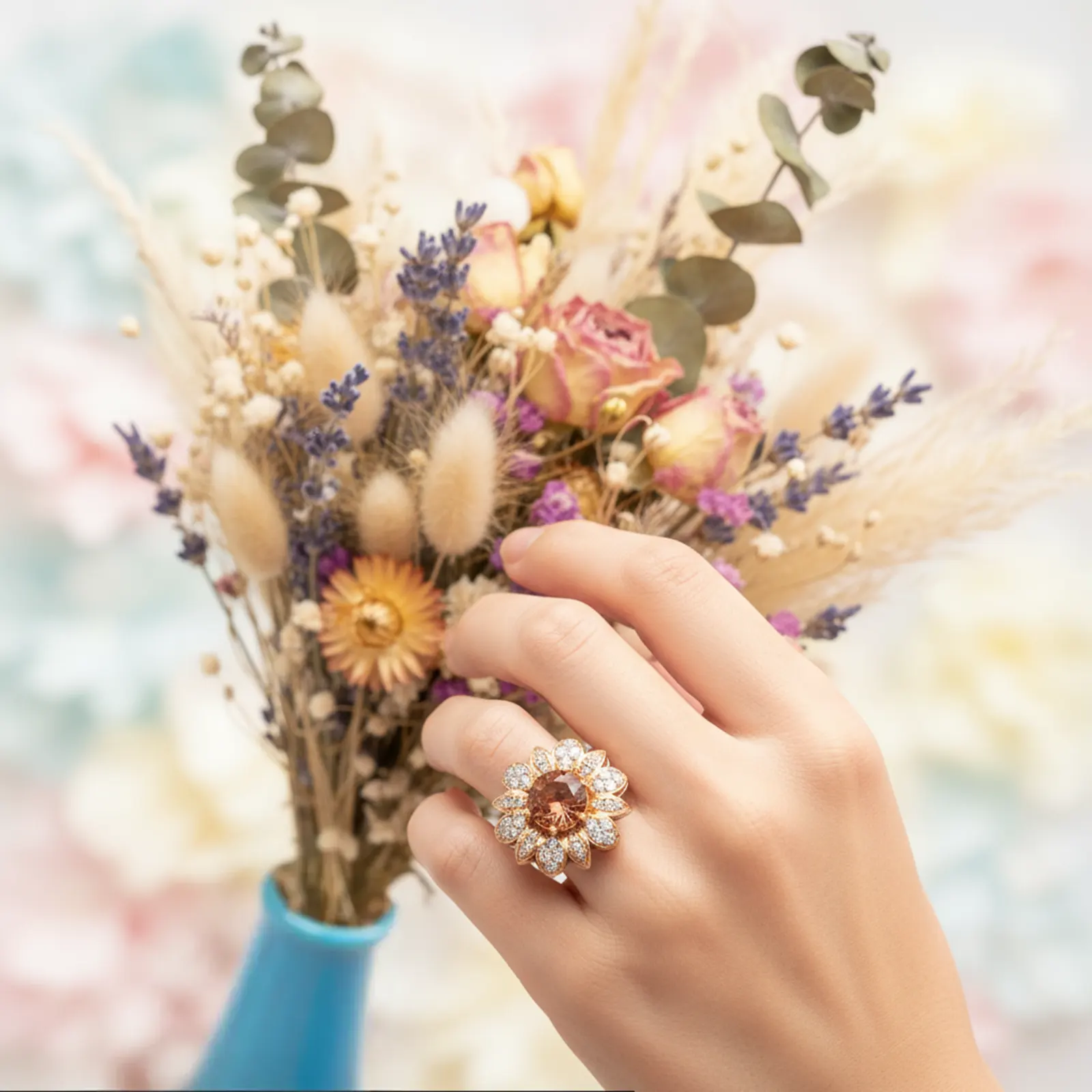 W centrum pierścionka osadzono zultanit - kamień, który w zależności od oświetlenia zmienia kolor od złocisto-brązowego po bursztynowy. Otaczające go cyrkonie tworzą kompozycję przypominającą rozłożyste płatki kwiatu, dodając całości blasku i elegancji.