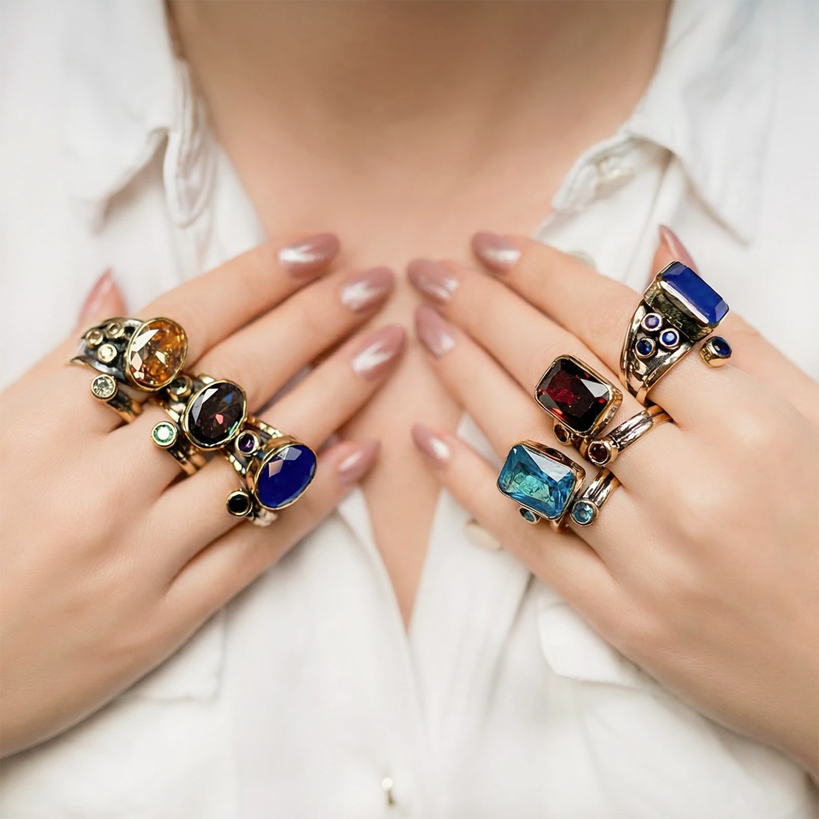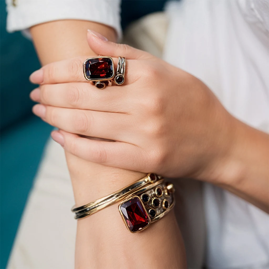 Orientalna stylistyka i głęboki blask kamieni spotykają się w pierścionku ze srebra 925 miejscami pokrywanym brązem. Główną ozdobą jest granat w szlifie prostokątnym gwiaździstym, którego nasycona barwa przypomina biżuterię zdobiącą kupieckie szlaki Wschodu. Po bokach dodano mniejsze granaty o okrągłym szlifie, wpisane w ręcznie zdobioną oprawę.