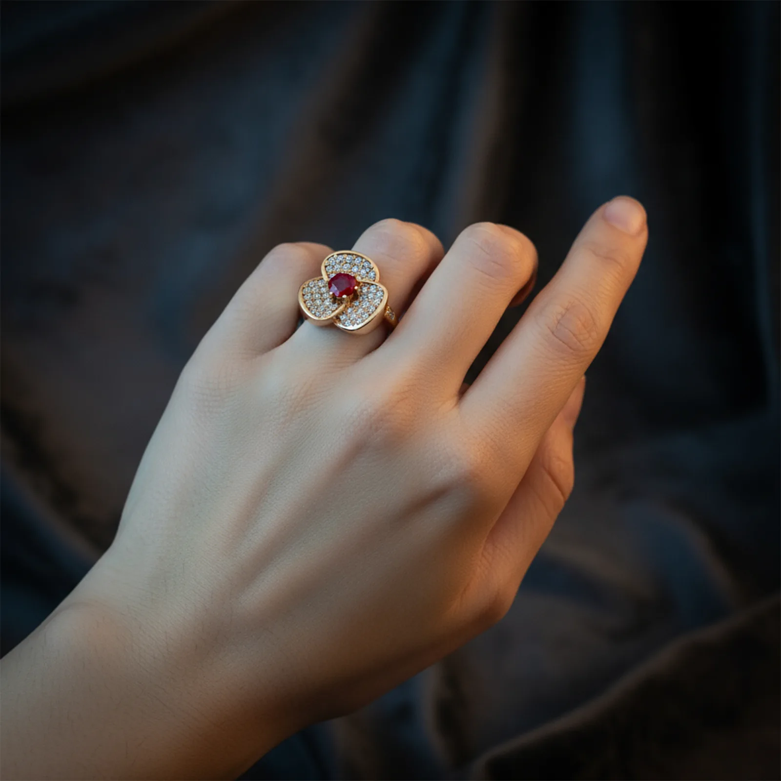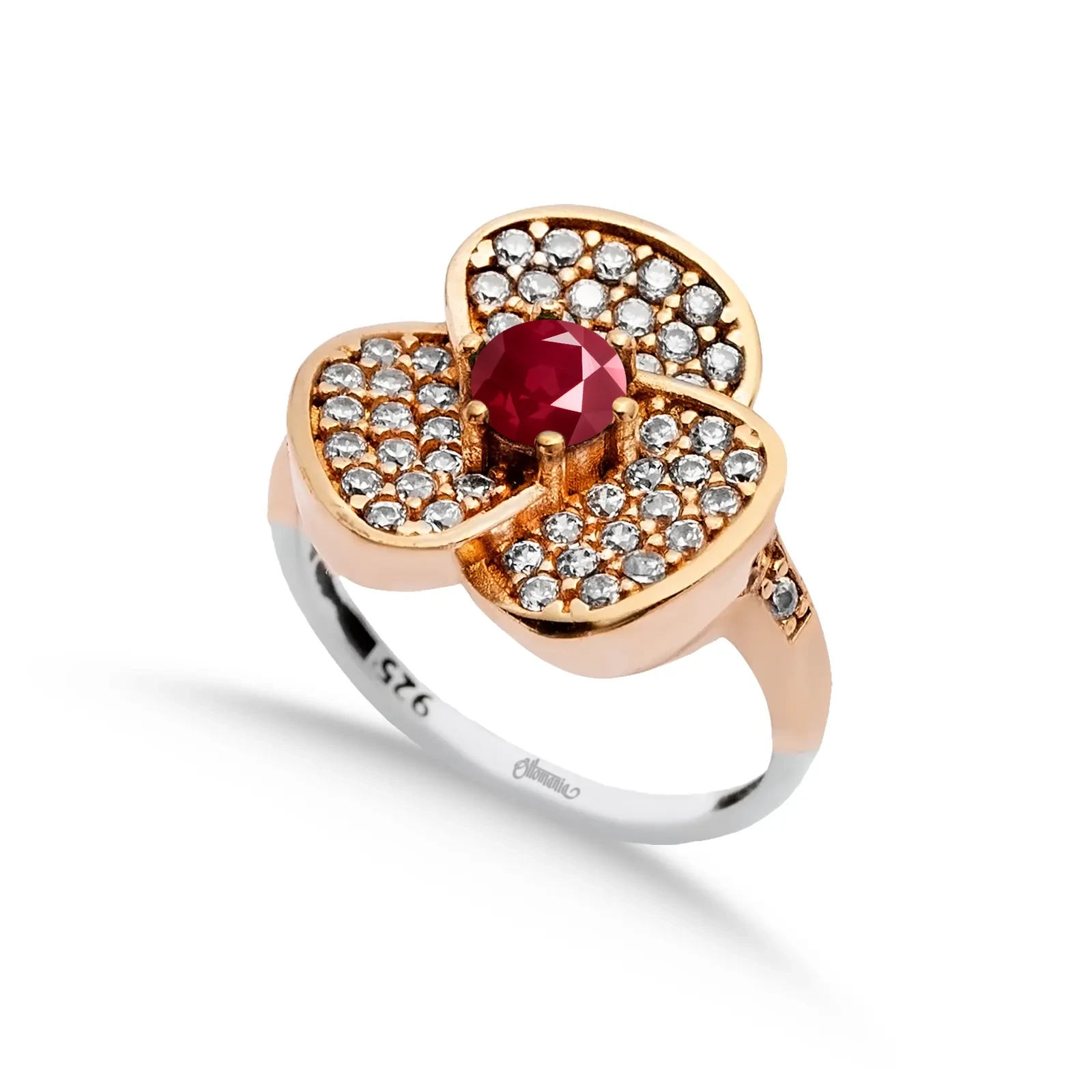 Kształt pierścionka inspirowany jest kwiatem o trzech płatkach, w którego sercu osadzono rubin - kamień miłości, energii i odwagi. Wokół niego rozmieszczono dziesiątki drobnych, przezroczystych cyrkonii, które pięknie odbijają światło, dodając kompozycji blasku i głębi.