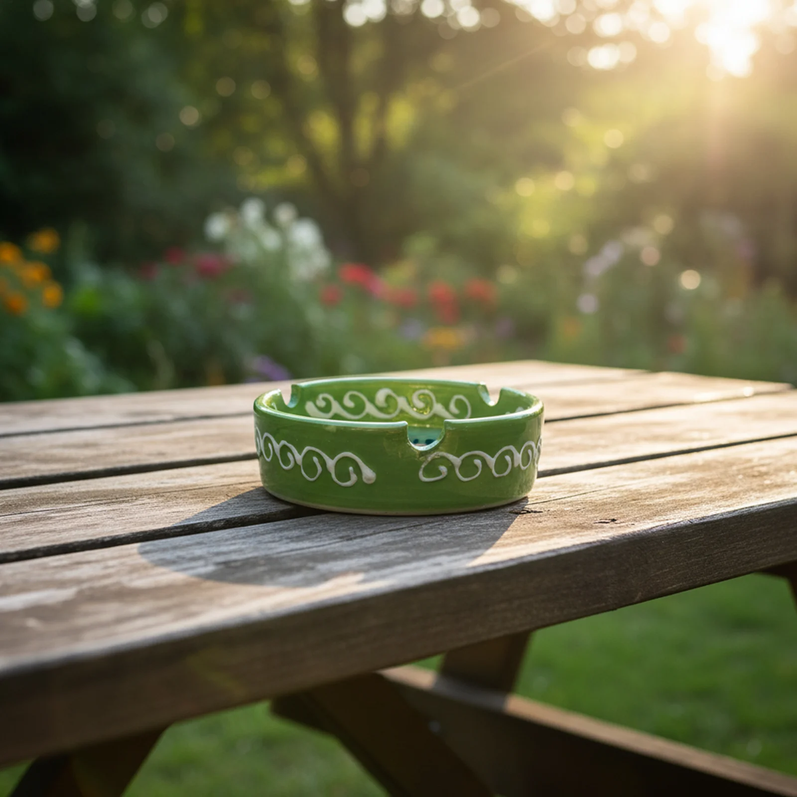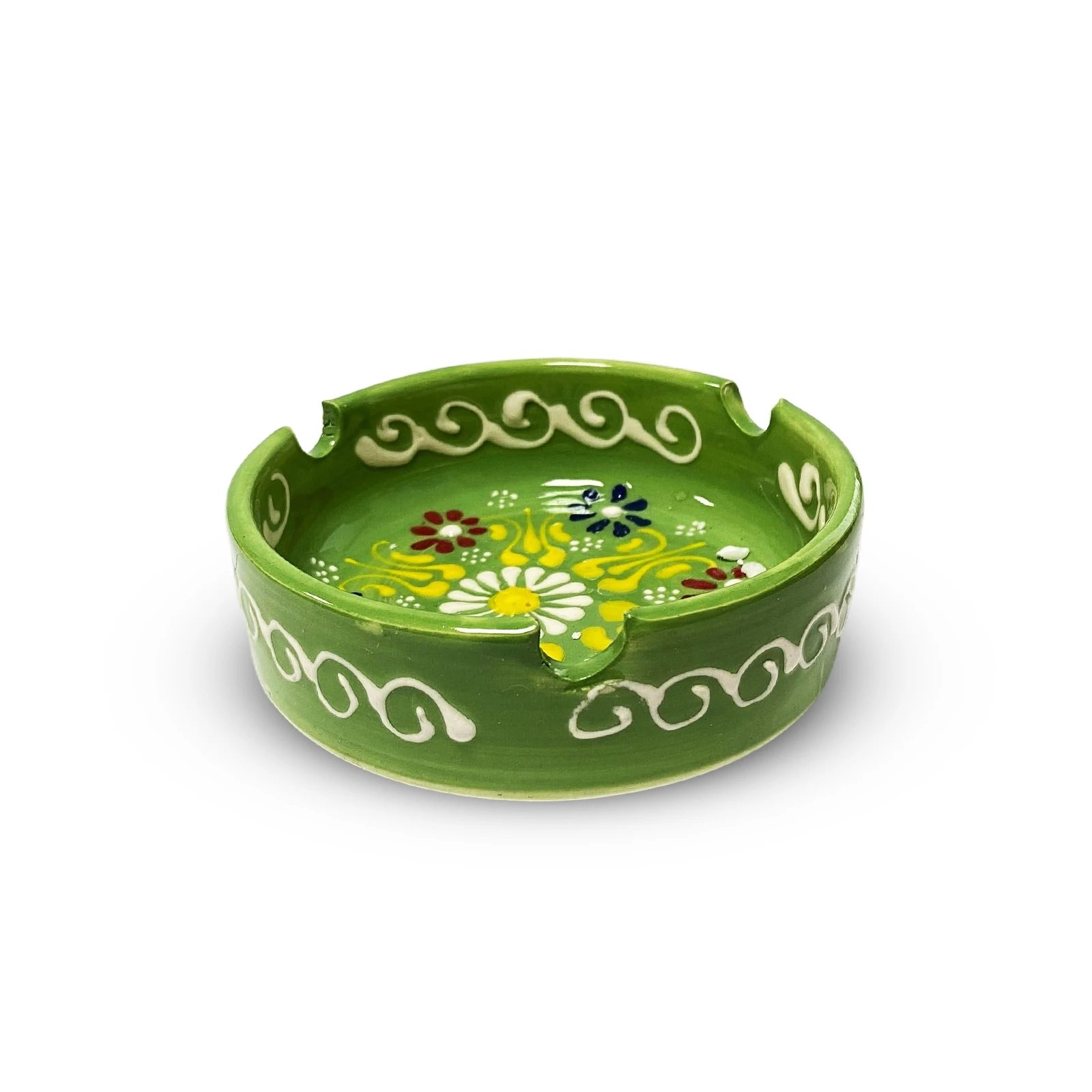 Ręcznie formowana i szkliwiona popielniczka ceramiczna w kolorze zielonym łączy funkcjonalność z dekoracyjnym charakterem. Wnętrze zdobi barwny, turecki motyw kwiatowy, a brzeg - białe, wypukłe ornamenty dodające jej lekkości i charakteru. Idealna do domu, ogrodu, kawiarni czy na taras.