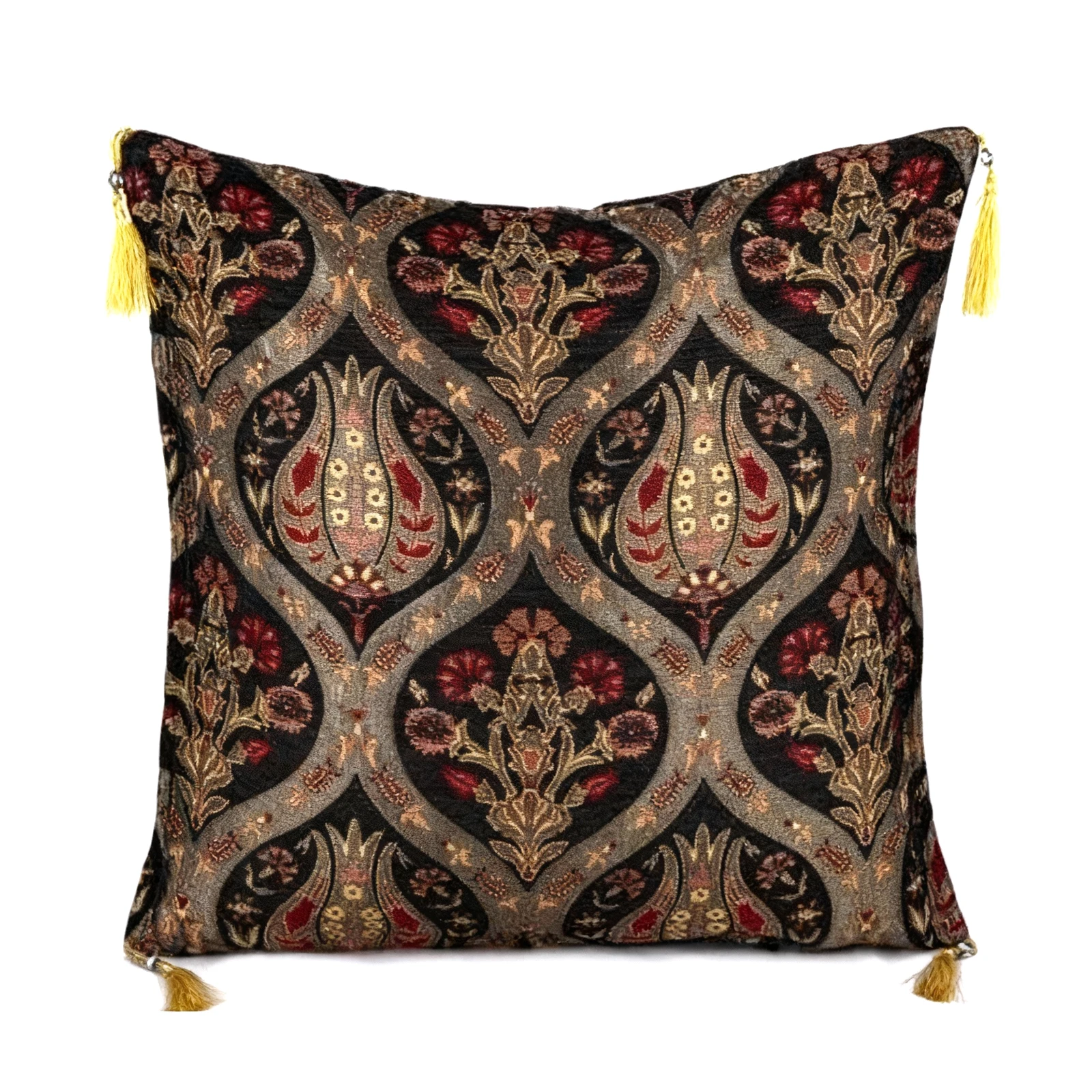 Połączenie odcieni czarnego, złotego i czerwonego to idealne zestawienie, dzięki którym ożywisz pomieszczenie. Kilim jest gęsto tkany i wykonany bardzo starannie, co wpływa to na wysoką jakość poszewki. Ciekawy akcent nadają frędzelki, na których zaczepiony jest koralik z okiem proroka. Więcej informacji o symbolice oka znajdziesz poniżej. Prezentowana czarna poszewka z frędzlami będzie też idealnym prezentem dla bliskiej osoby.