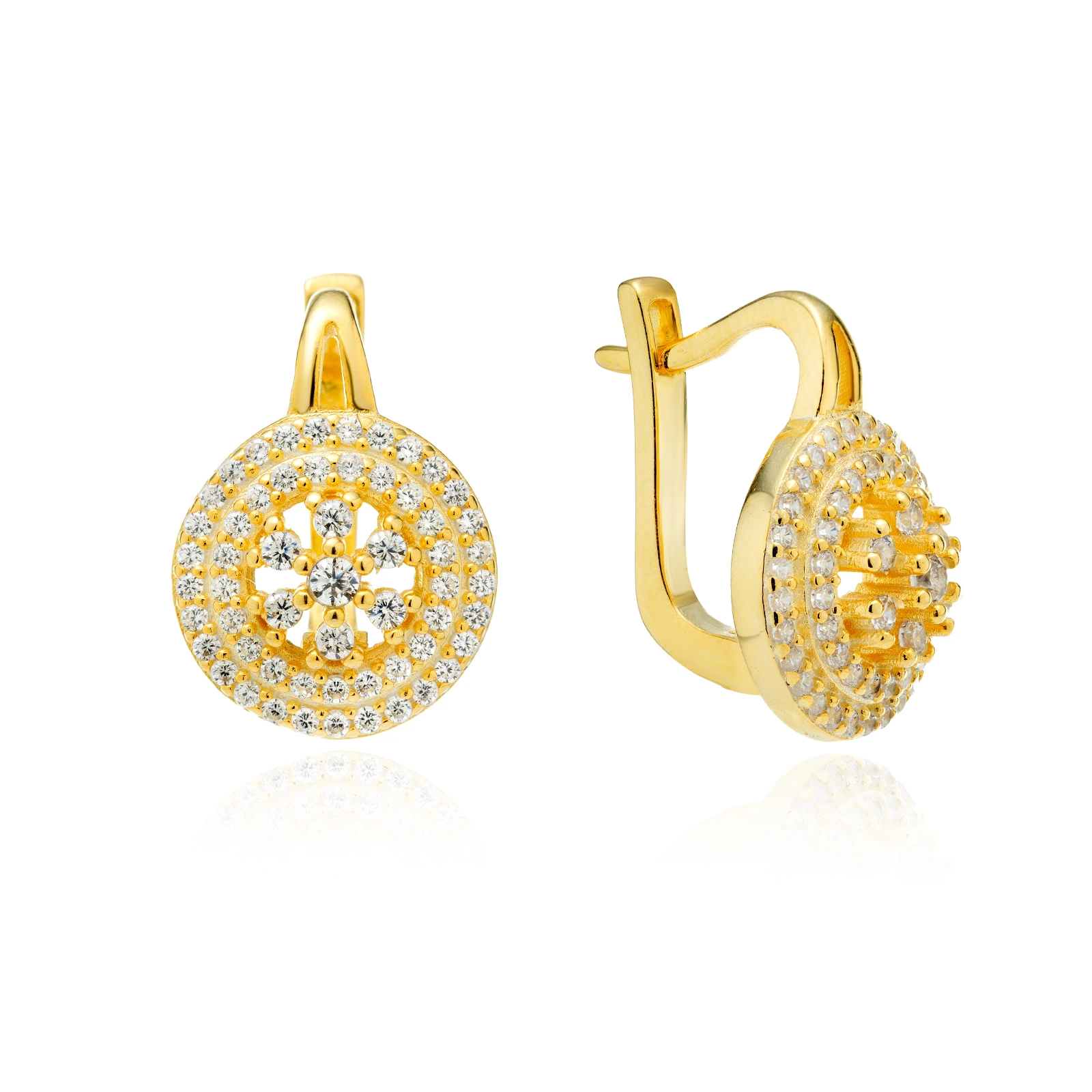Kolczyki zachwycają okrągłą formą ozdobioną dwoma rzędami lśniących cyrkonii. Wewnętrzny rząd cyrkonii jest mniejszy, a zewnętrzny większy, co tworzy efektowny, koncentryczny wzór. Starannie osadzone kamienie pięknie odbijają światło, dodając biżuterii subtelnego blasku. Ażurowa rozeta nadaje kolczykom lekkości i delikatności, a precyzyjne wykonanie podkreśla ich wyjątkowy charakter. Wykonane z pozłacanego srebra próby 925, zachwycają ciepłym, złotym odcieniem. Dzięki wygodnemu zapięciu typu bigiel zapewniają komfort noszenia. Idealnie komponują się zarówno z codziennymi, jak i eleganckimi stylizacjami, dodając im odrobiny luksusu i wyrafinowania.